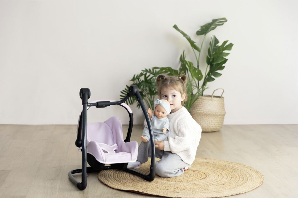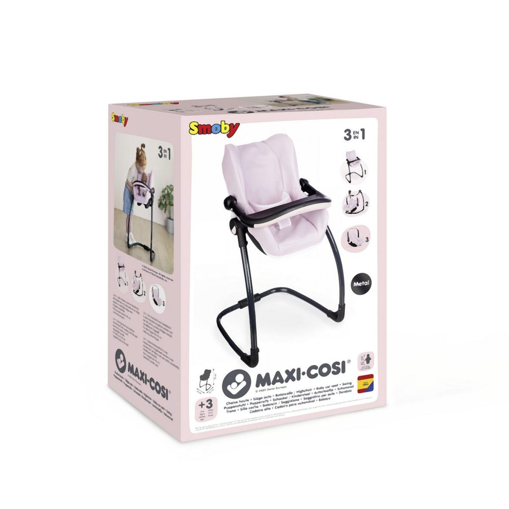Autosedačka Maxi-Cosi 3 v 1 pro panenky. Při zavěšení sedačky na konstrukci je rázem houpačka pro panenku do velikosti 42 cm. Otočením konstrukce získáte vysokou jídelní židličku s pultíkem. Rozměry …