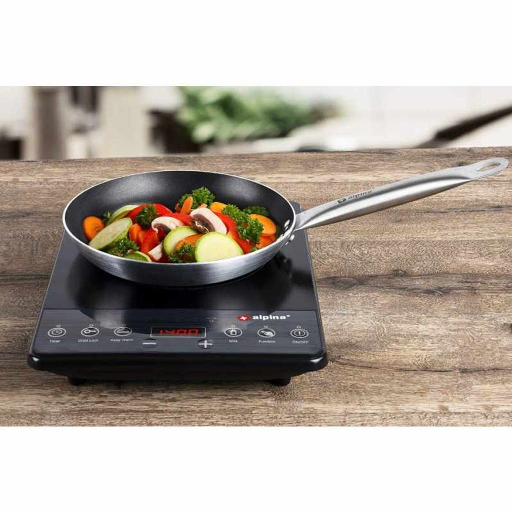 ALPINA Indukční vařič jednoplotýnkový 2000W ED-218286 Produkt – indukční vařič je ideální pro to, abyste si jej mohli vzít s sebou, když jdete na kempování s rodinou a přáteli nebo vaříte rychlé jídlo ve svém studentském pokoji. Funguje s proudem, lze jej tedy kamkoliv zapojit k vařeníVlastnosti – sporák lze ovládat pomocí touchpadu na přední straně. Má ochranu před přehřátím.Technologie – při indukčním vaření se varné nádoby ohřívají přímo indukcí, místo toho, aby se spoléhaly na nepřímé záření, konvekci nebo vedení tepla.Styl – jednoduchý a stylový černý design.Velikost – jedná se o malý a praktický jednotlivý vařič, samotná varná deska má průměr 22 cm.Popis produktuVaření kdekoli a kdykoli chcete: Tato indukční varná deska s 1 plameny od Alpina je lehká a malá a lze ji vzít všude s sebou. Například na dovolené! Černou, skleněnou desku můžete ovládat jednoduše pomocí tlačítek a 4místného displeje. Můžete si tak vybrat z 10 stupňů, které vám umožňují regulaci 60 až 240 stupňů Celsia. Indukční varná deska Alpina také dělá váš domov mnohem bezpečnějším. Dětská pojistka zajišťuje, že se vaše děti neočekávaně neporaní a ochrana proti přehřátí a automatické vypnutí riskují z vaření. Bezpečné vaření ještě nikdy nebylo tak zábavné a bylo tak snadné!