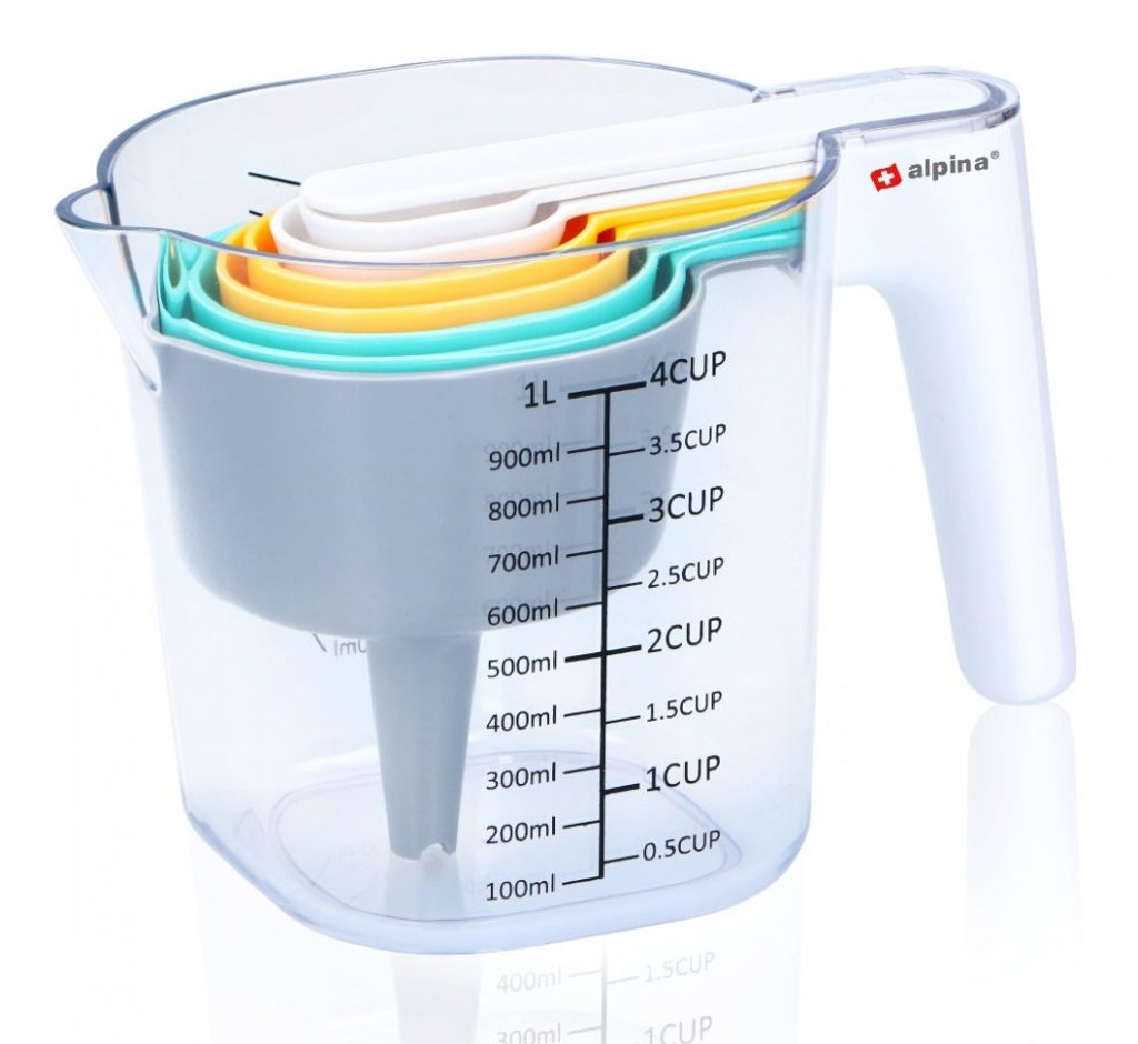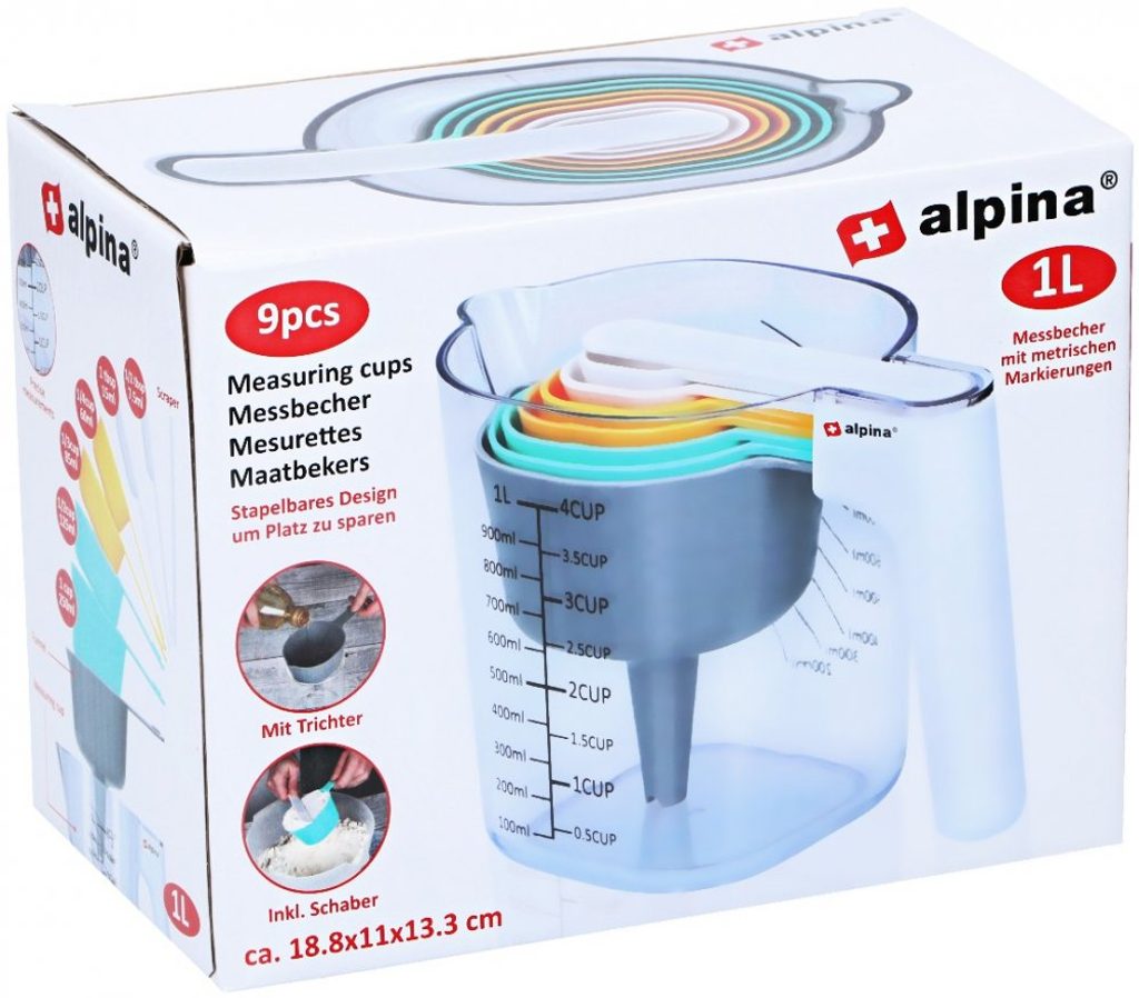 ALPINA Kuchyňské odměrky sada 9 ks ED-224934 9dílná sada odměrek od Alpiny nesmí chybět v žádné kuchyni. Díky technologii stohování nejen šetří místo, ale je také všestranná. Velká odměrka má metrické značení a má kapacitu 1 litr. 6 malých odměrek má kapacitu 7,5...250 ml.Dodávka obsahuje nálevku a škrabku. Vlastnosti: - 9dílná, prostorově úsporná sada - Velká odměrka s objemem 1 l - 6 malých odměrek: 7,5 ml, 15 ml, 60 ml, 85 ml, 125 ml, 250 ml - Součástí dodávky je nálevka a škrabka - Rozměry (DxŠxV): 188x110x133 mm