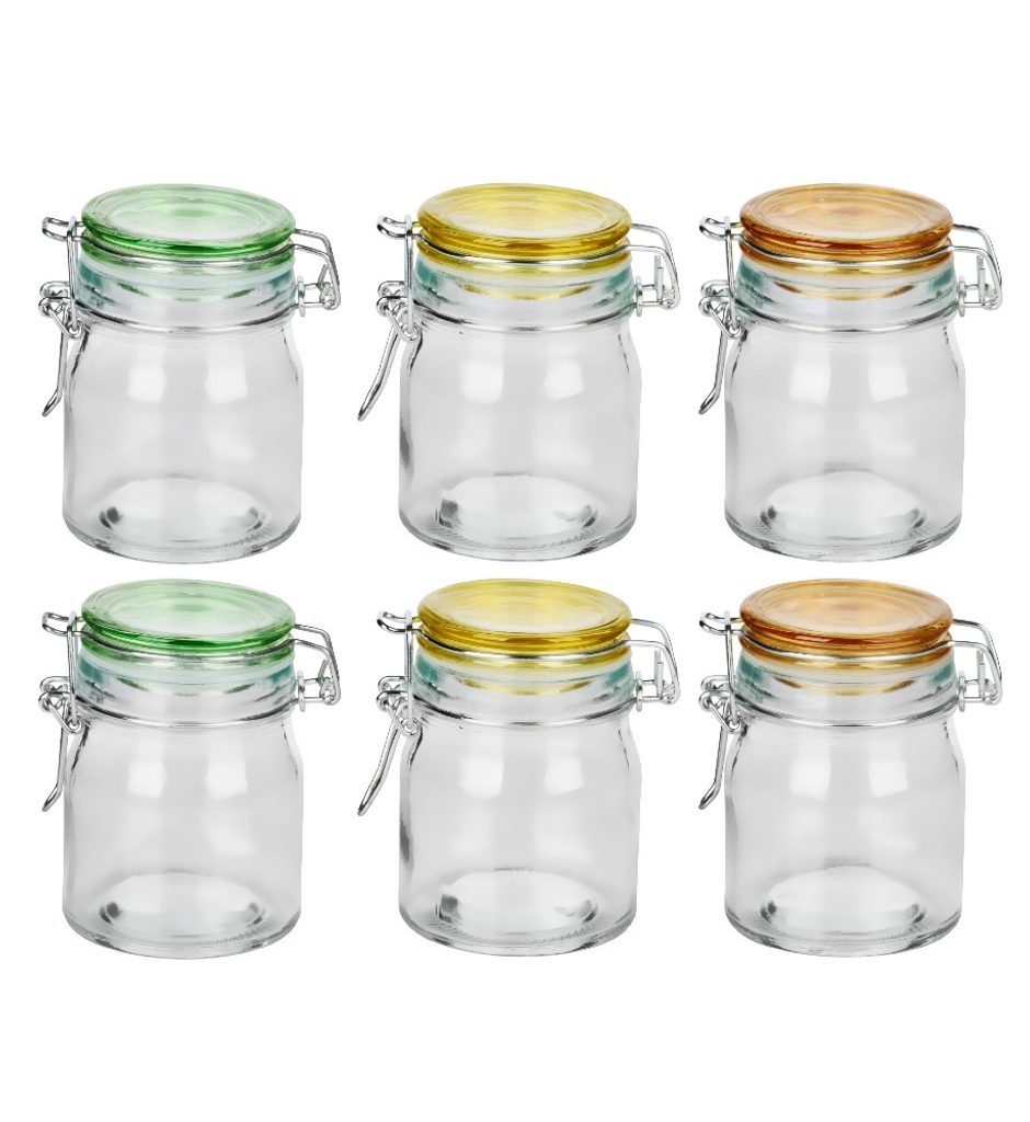 • Obsah: 6 skleněných dóz s víčky v různých barvách