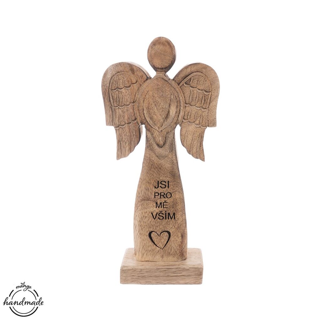 Anděl z přírodního mangového dřeva vnese do vašeho domova klid, harmonii a dotek jemné elegance. Tato nádherná dekorace okouzlí svým jednoduchým, ale zároveň silně působivým designem, který podtrhuje přirozená kresba dřeva. Každý anděl je originál – díky ručnímu zpracování a přírodnímu materiálu. Na přední straně anděla je nápis „Jsi pro mě vším“, který dodává dekoraci hluboký osobní význam. Tento anděl je nejen krásným doplňkem interiéru, ale také ideálním dárkem pro někoho, na kom vám záleží. Materiál: mangové dřevo. Rozměry: š. 13,5 cm, v. 30 cm.