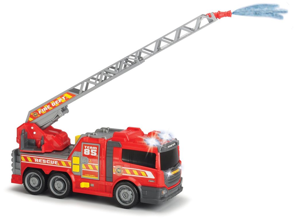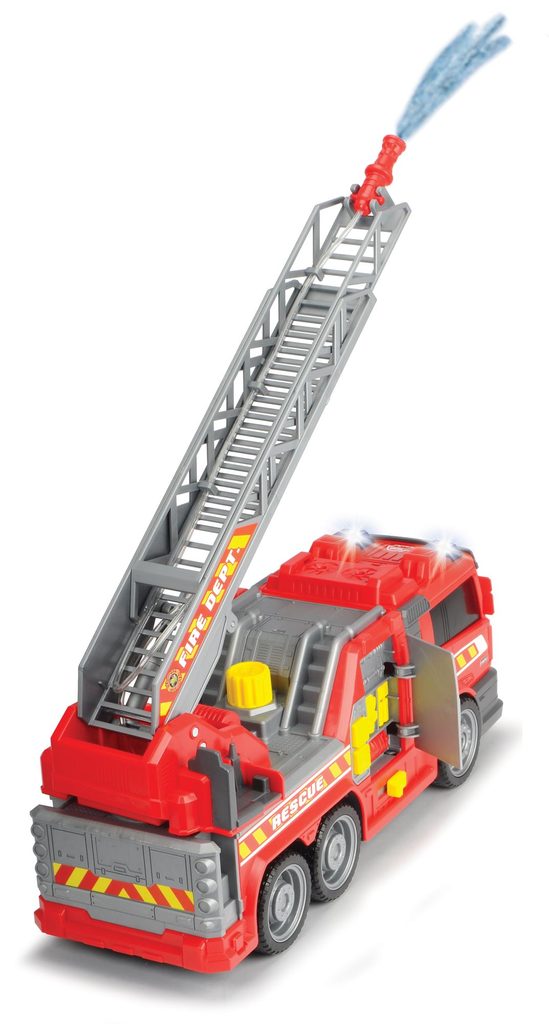 Hasičské auto se žebříkem na volnoběh. Se zvukovými a světelnými efekty, s funkční stříkačkou na manuální ovládání a s otevíracím bočním panelem. Délka 36 cm.