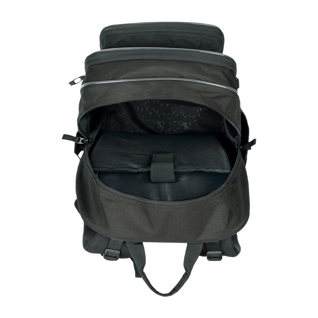 • Tři samostatně uzavíratelné komory s vnitřním organizérem a kapsou na 15palcový notebook či tablet. Tento vnitřní organizér umožňuje rovnoměrné rozložení hmotnosti.