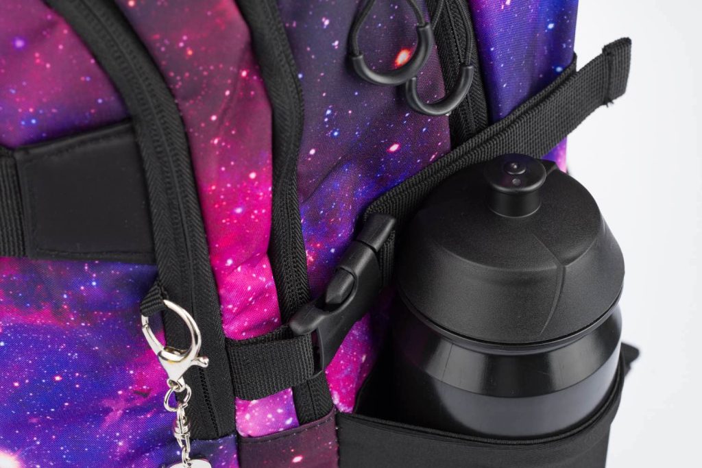 • Boční kapsy z elastického materiálu, které jsou vhodné pro jednu z našich láhví na pití.