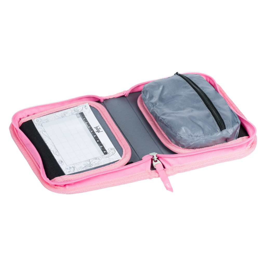 • Uvnitř aktovky je průhledná kapsa na rozvhr a vnitřní organizér umožňující rovnoměrné rozložení hmotnosti, doplněný gumičkou pro fixaci.