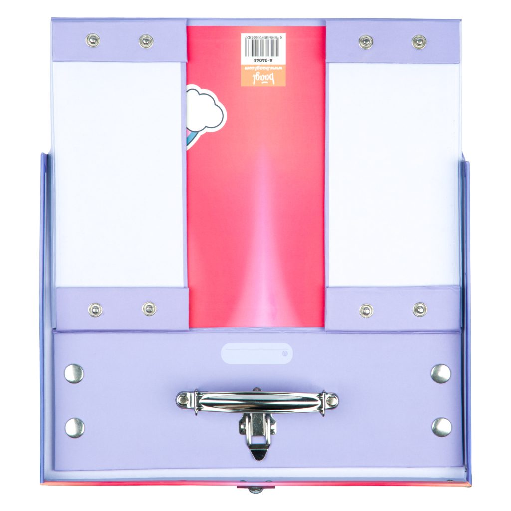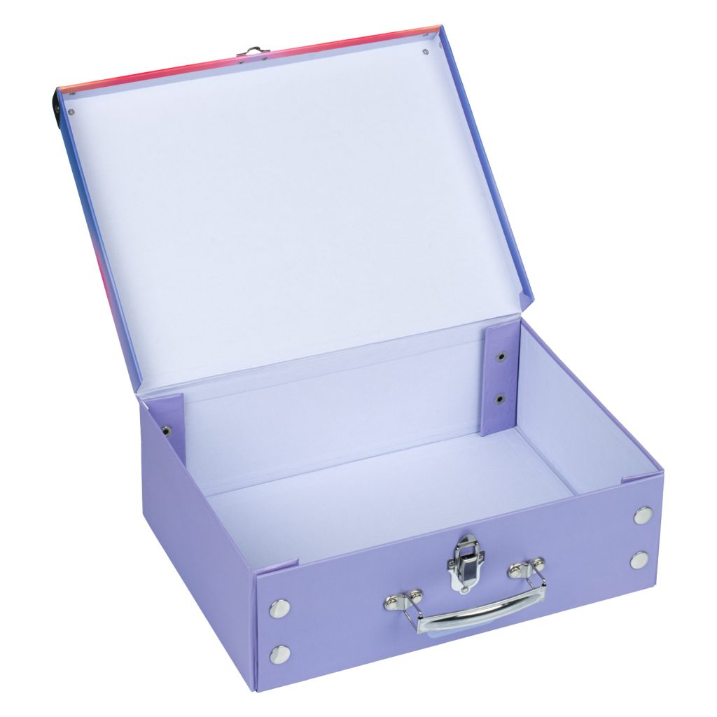 • Skládací kufřík z pevného laminovaného papíru s okovanými rohy.