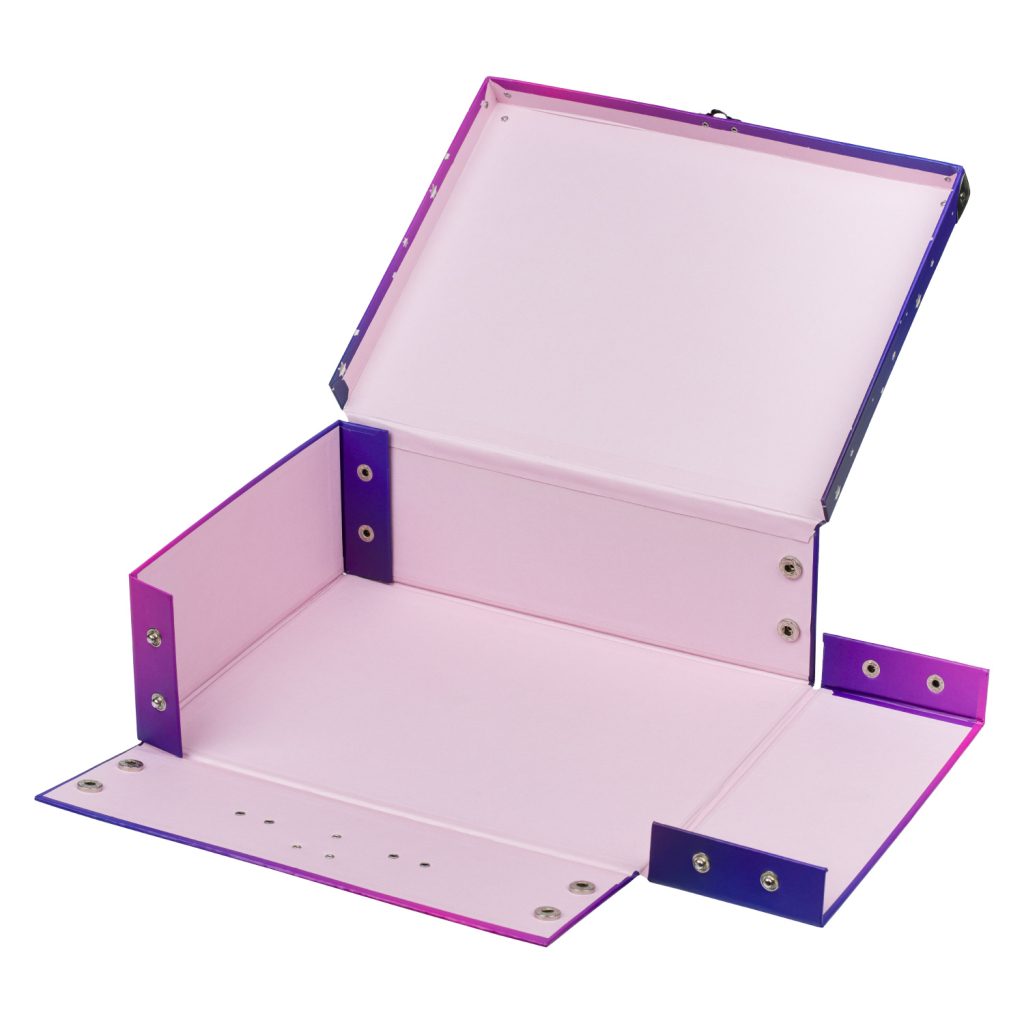 • Díky důmyslnému systému patentek lze kufřík s okovanými rohy snadno složit i rozložit během několika vteřin.