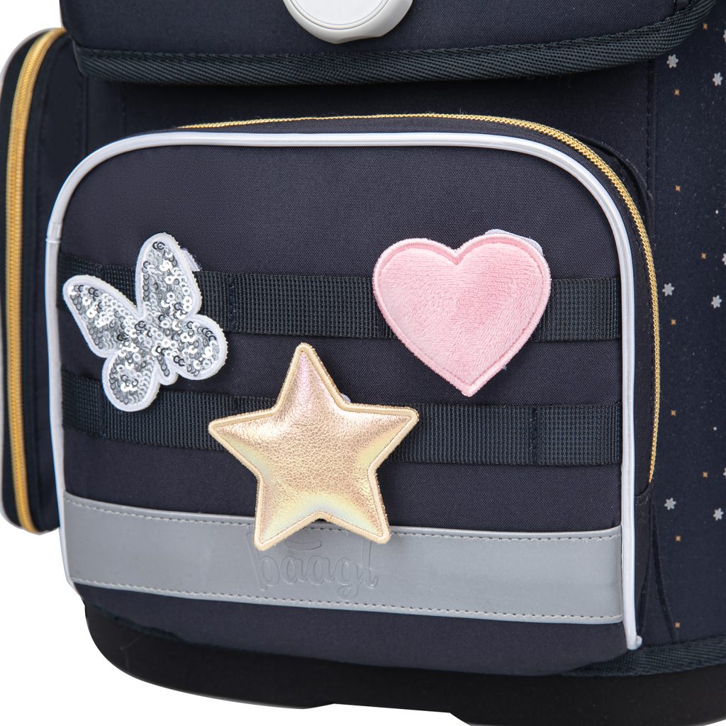 • Unikátní systém vyměnitelných odznáčků umožňuje přizpůsobit vzhled aktovky podle nálady a zájmů dítěte.
