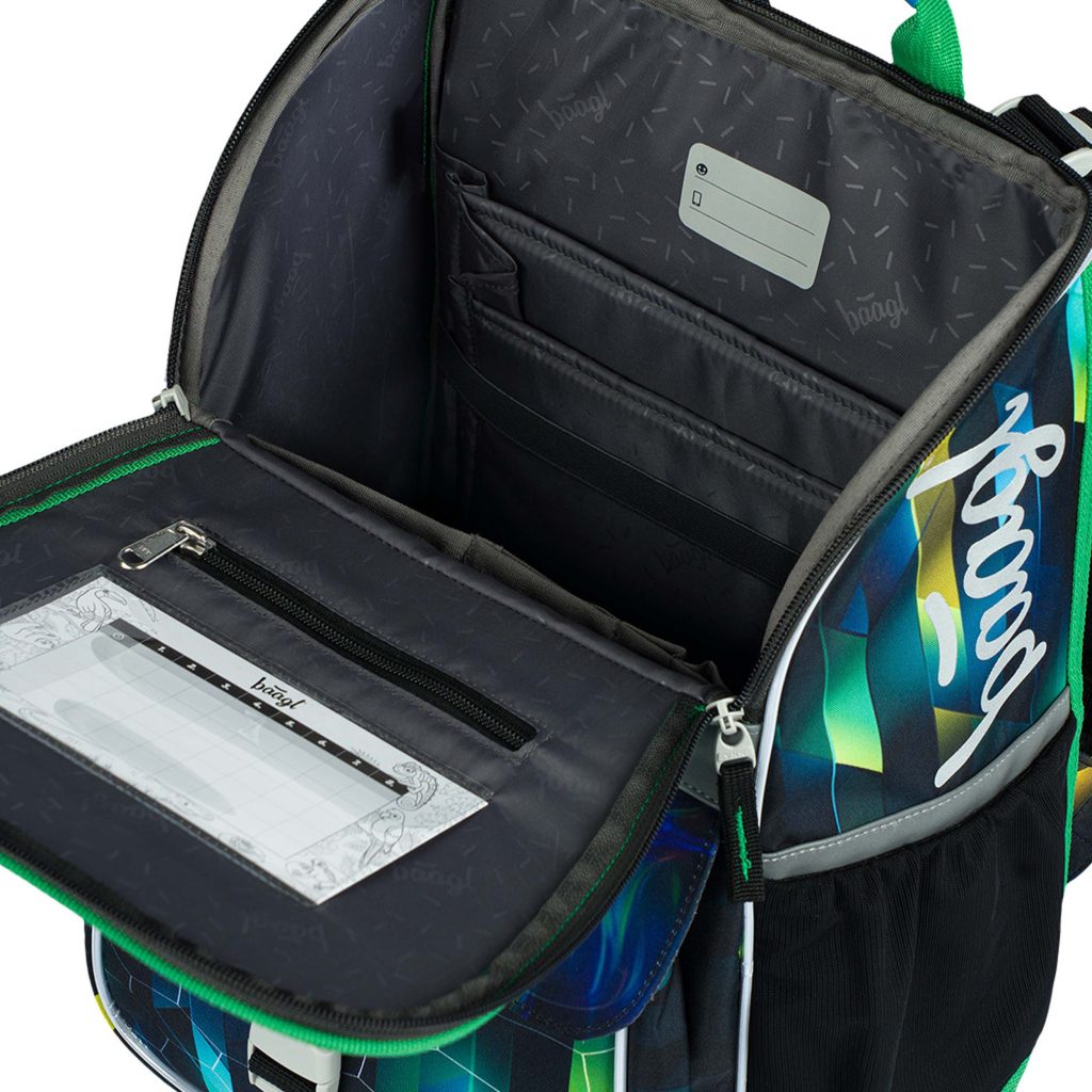 • Uvnitř aktovky je průhledná kapsa na rozvrh a vnitřní organizér umožňující rovnoměrné rozložení hmotnosti, doplněný gumičkou pro fixaci.