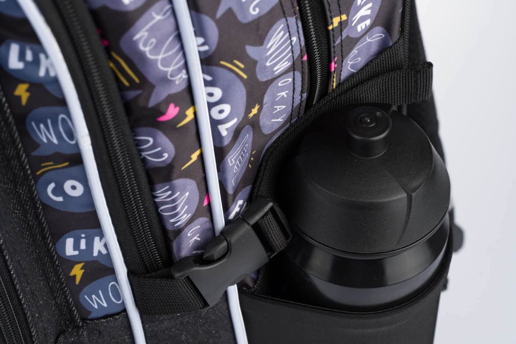 • Boční kapsy z elastického materiálu, které jsou vhodné pro jednu z našich láhví na pití.