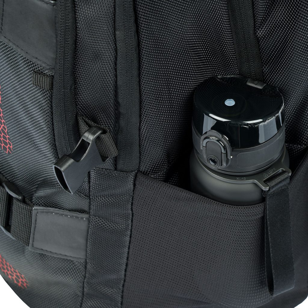 • Boční kapsy z pevné materiálu, které jsou vhodné pro jednu z našich lahví na pití.