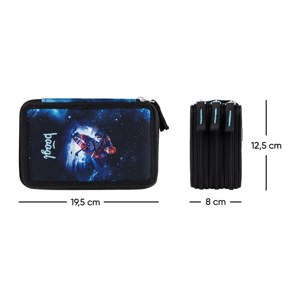 • Extra prostorný třípatrový penál na všechny psací potřeby.