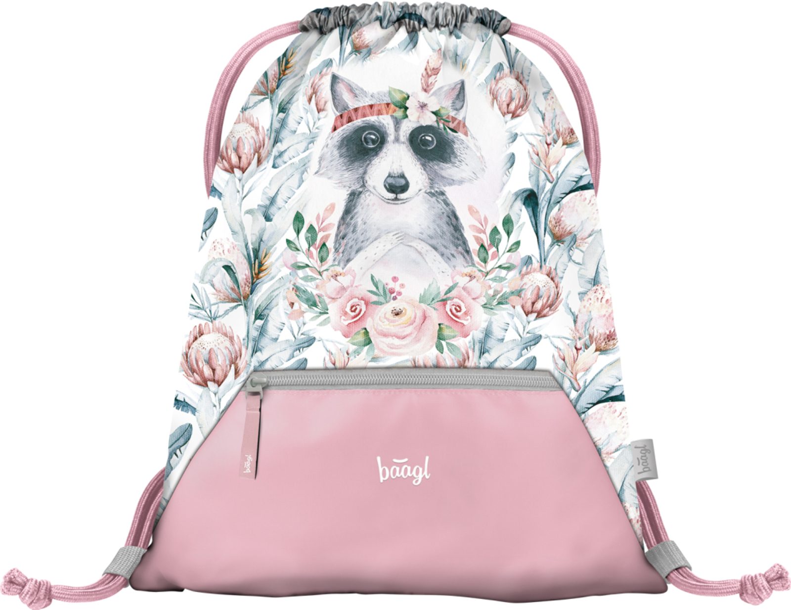 Sáček na tělocvik s designem květin a medvídka mývala, laděný do růžových odstínů a praktickou kapsičkou na přední straně.