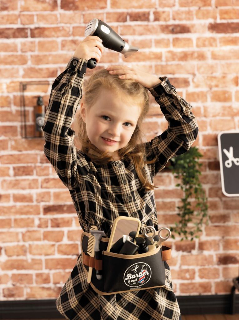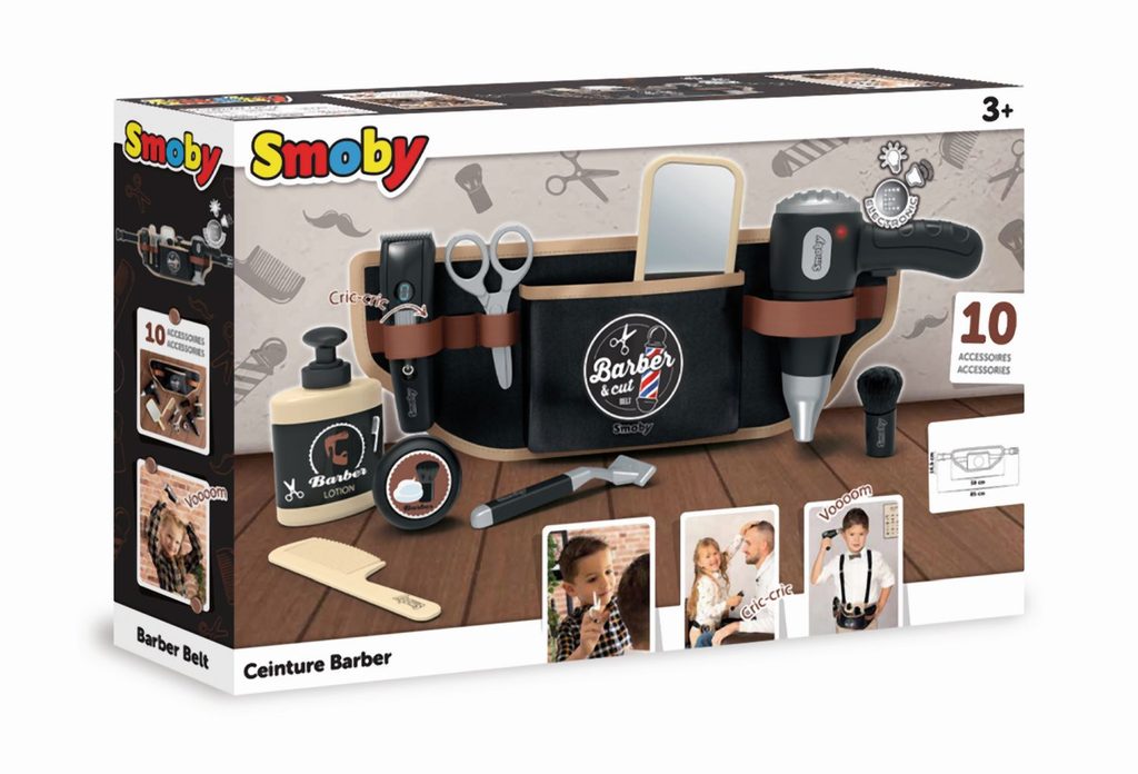 Nastavitelný holičský pás s 10 doplňky. Textilní pásek s nastavitelnou velikostí lze perfektně nastavit a snadno se nasazuje pomocí klipu vhodného pro děti. Gumičky drží deset doplňků: nůžky, mechanický zastřihovač vousů, pleťová voda, holicí strojek, zrcátko, elektronický fén se zvukem, mýdlo na ruce, hřeben a štětka na holení. Rozměry (DxŠxV): 38 x 4 x 14,5 cm.