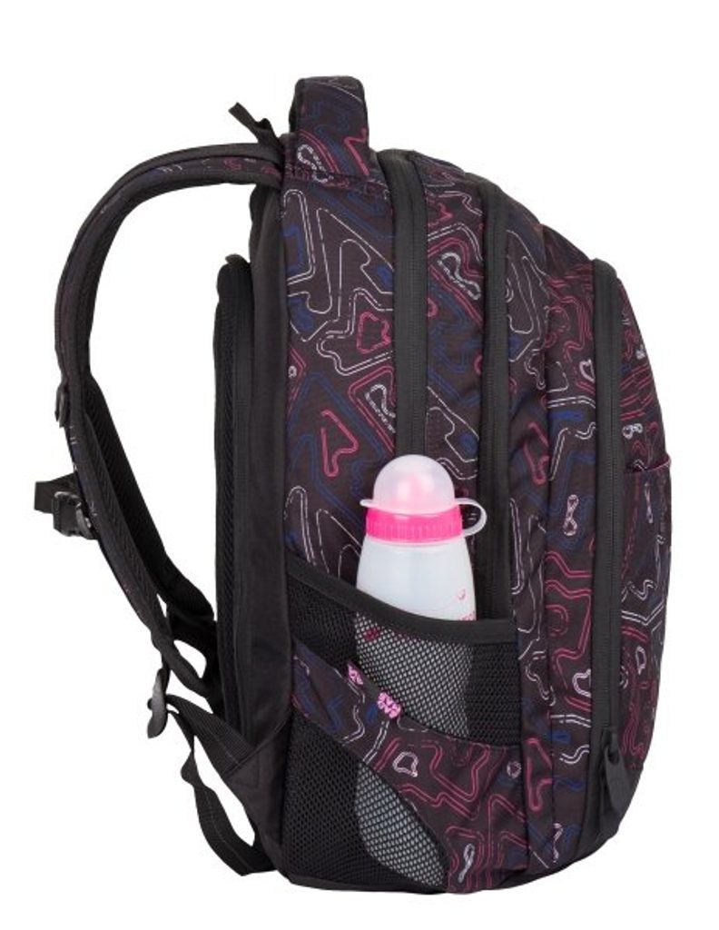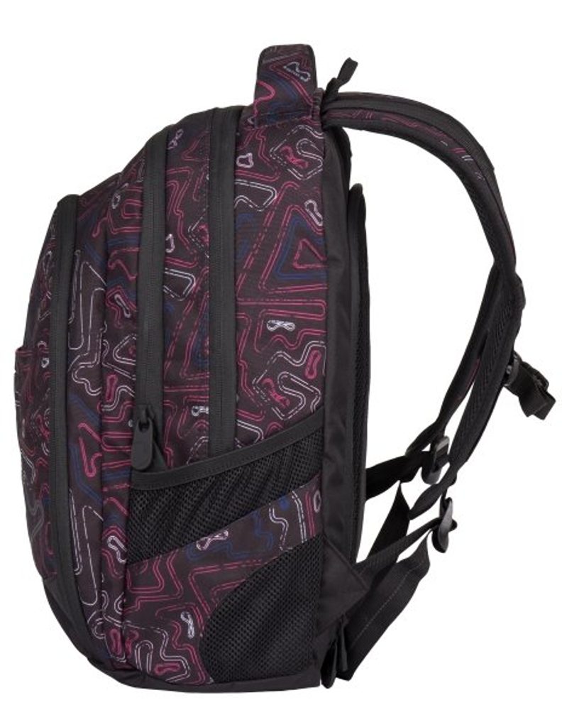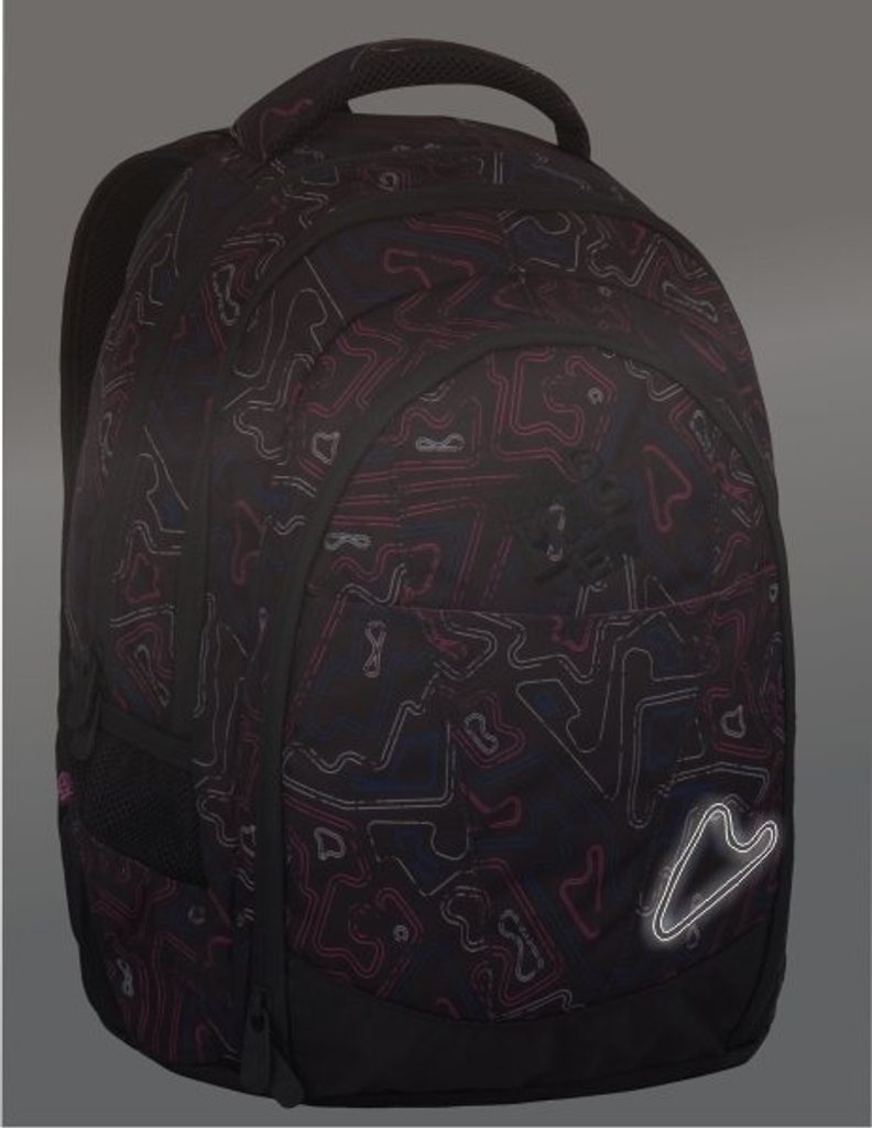 Hlavná komora je veľmi priestranná vhodná na školské dosky, tak na učebnice. Súčasťou hlavnej komory je vystužené vrecko na notebook do 15,4" Prepásané popruhom na suchý zips k fixácii notebooku. Rozmery vrecka na notebook 29 x 28 x 4 cm. Na chrbáte batohu je vrecko na zips, ktoré skrýva vystužené vrecko na MP3 prehrávač s vývodom na sluchátka v hornej časti. Rozmery vrecka na MP3 prehrávač (12 x 14 x 2 cm). V tomto špeciálnom skrytom vrecku sú 2 sieťové vrecká na zips. A vnútri je ešte popruh na suchý zips napr. k prevlečeniu sluchátok alebo k zaveseniu kľúčov a pod. Do tohto vrecka je možné vložiť zošit A4.