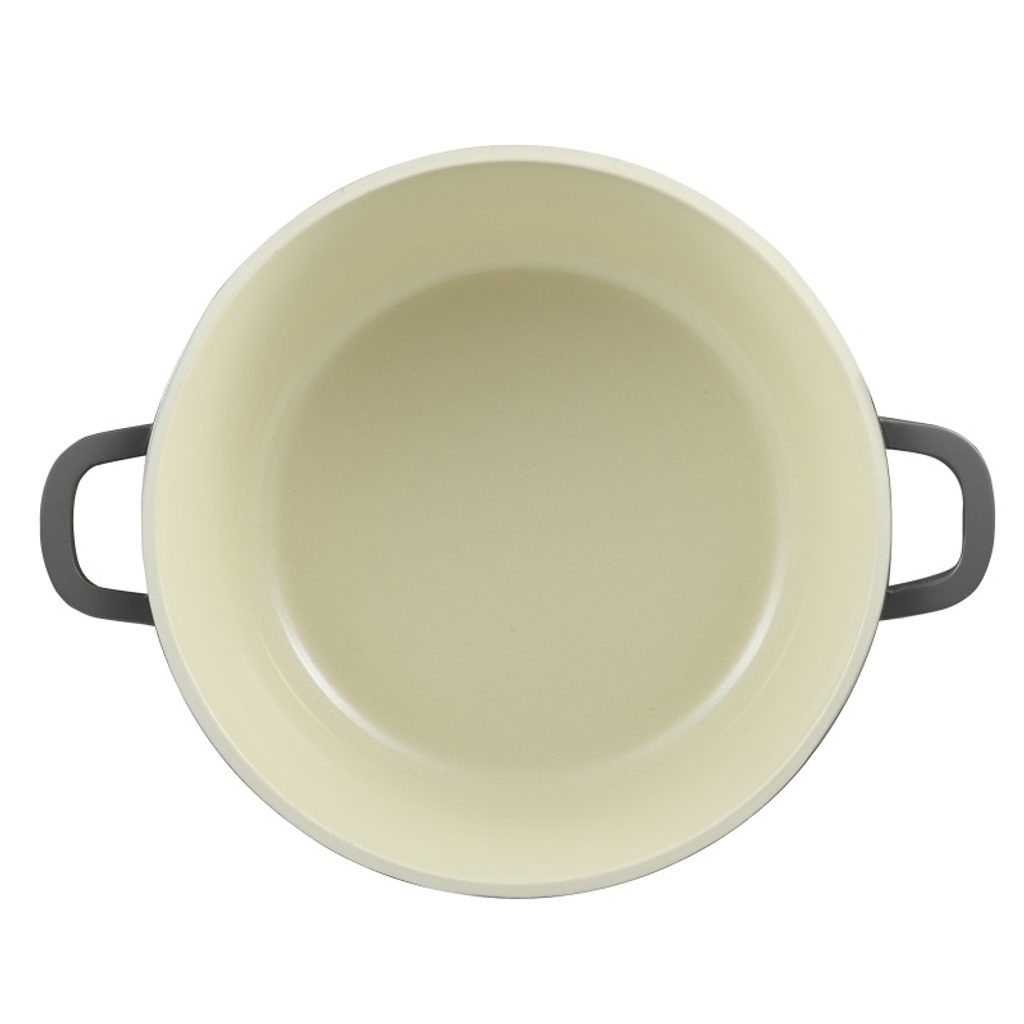 Vnitřní povrch: Krémový nepřilnavý nátěr, který nejen krásně kontrastuje s vnější barvou, ale hlavně zajišťuje snadné vaření bez připékání a rychlé čištění.