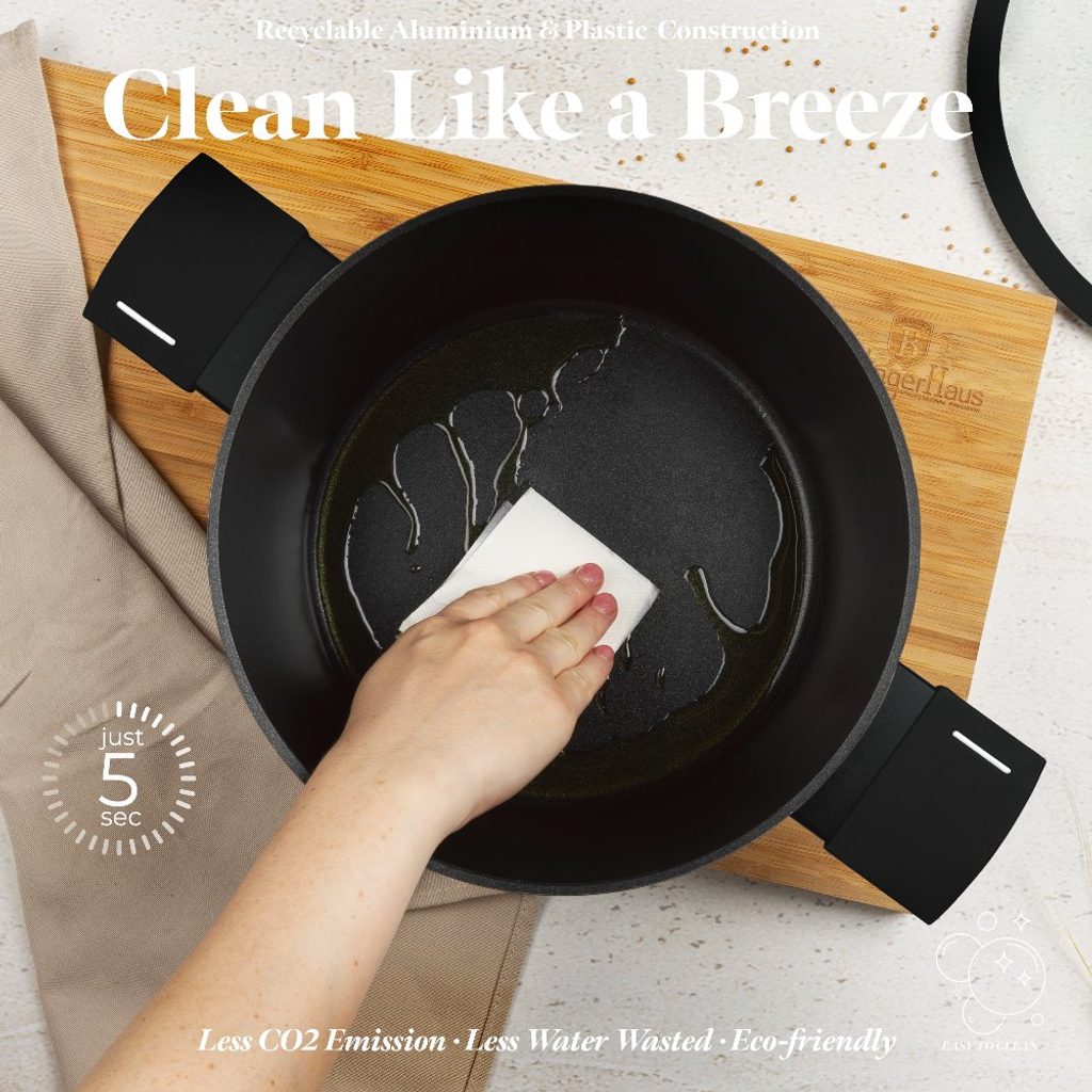 Tento hrnec je vyroben z kovaného hliníku s 3 vrstvým nepřilnavým povrchem TitanPro, který zajišťuje vysokou kvalitu a odolnost. Hrnec má rozměry 24x11 cm a objem 4,1 litru. Matná černá barva a minimalistický styl dodávají hrnci moderní vzhled. Ergonomická rukojeť Soft Touch Stay Cool zajišťuje pohodlné a bezpečné používání. Cedící poklice je vyrobena z tvrzeného skla s tepelně odolným silikonovým systémem Soft Close.