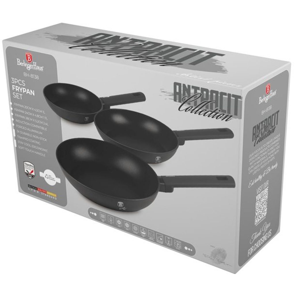 BERLINGERHAUS Sada pánví s titanovým povrchem 3 ks Antracit Collection BH-8138 Sada tří pánví vyrobených z kovaného hliníku s nepřilnavou vrstvou TitanPro. Tato sada obsahuje pánve o rozměrech 20*4,5 cm (1,0L), 24*4,8 cm (1,7L) a 28*5,2 cm (2,4L). Každá pánev je pokryta 3vrstvým odolným nepřilnavým povlakem TitanPro, který zajišťuje snadné vaření a čištění.