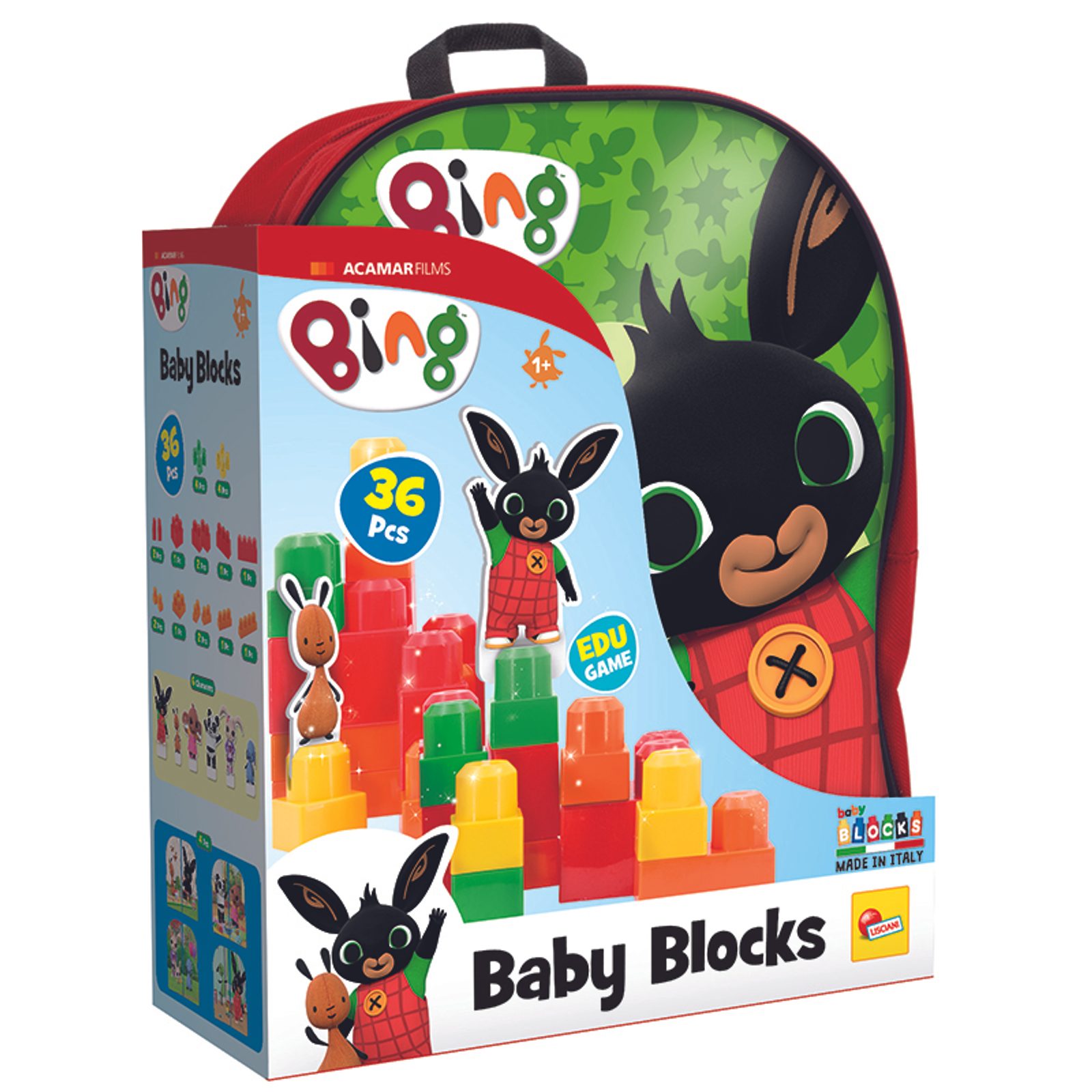 Batoh s oblíbenou dětskou postavičkou Bingem. V batůžku jsou kostky Baby Blocks pro nejmenší a kartičky postaviček z oblíbeného dětského seriálu. Doporučený věk od 1 roku.