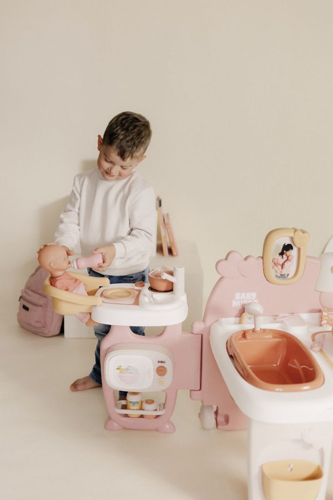 Hrací centrum pro panenky Baby Nurse se 3 hracími zónami je vybaveno transportními kolečky, rukojetí a je skládací pro snadnou přepravu. Po otevření překvapí třemi prostornými hracími koutky: kuchyňkou, koupelnou a ložnicí. Mycí prostor je vybaven odnímatelnou vaničkou, hned vedle je přebalovací pult, který zároveň slouží jako šatna. Pod komodou je věšák na ručníky, háček na kabát a vyjímatelný odpadkový koš. Rám obrazu na zadní stěně lze přizpůsobit vlastními fotografiemi. Jídelní kout se sedátkem pro panenky má dřez s baterií (nefunkční), varnou desku, mikrovlnnou troubu a odkládací police. Spací část obsahuje postýlku pro panenky, otočný kolotoč a fosforeskující lampu. Příslušenství: lahvičky, talíře se lžičkami, hrnce, klinické teploměry a různé nádoby a prázdné obaly na hraní. Vhodné pro panenky do 42 cm (panenka není součástí balení). Tento výrobek obsahuje minimálně 78 % recyklovaného materiálu. Rozměry složeného produktu (DxŠxV): 68 x 71 x 71 cm. Rozměry produktu v rozloženém stavu (DxŠxV): 149 x 71 x 71 cm.
