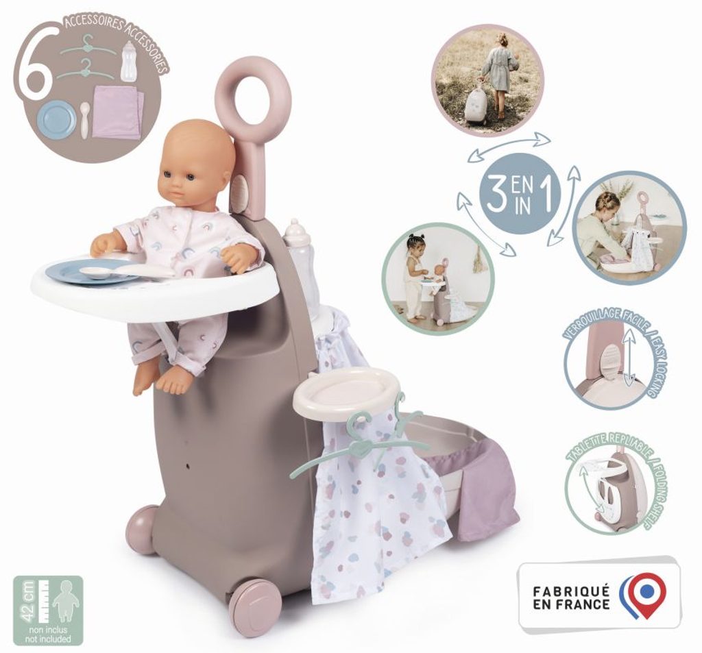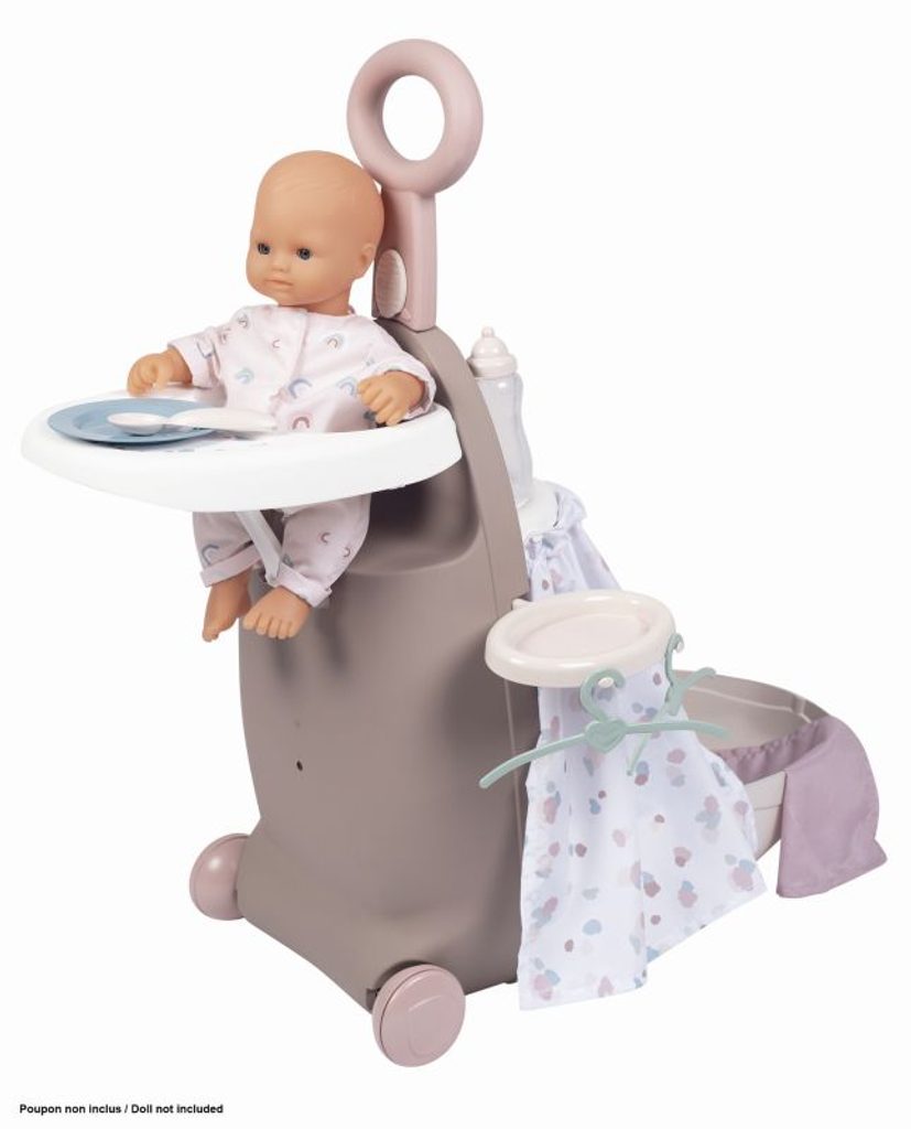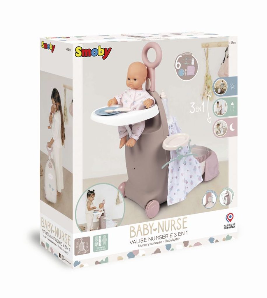 Praktický kufříka na kolečkách a s madlem pro snadný přenos z řady Baby Nurse lze snadno rozložit a stane se z něj všestranný ráj na hraní pro panenky: je zde spací kout s pohodlnou postelí, útulnou přikrývkou a polštářkem, stejně jako jídelní kout s dětskou židličkou a podnosem. 6 ks příslušenství. Vhodné pro všechny panenky do 42 cm. Panenka není součástí balení. Rozměry produktu (DxŠxV): 25,5 x 25,5 x 62 cm.