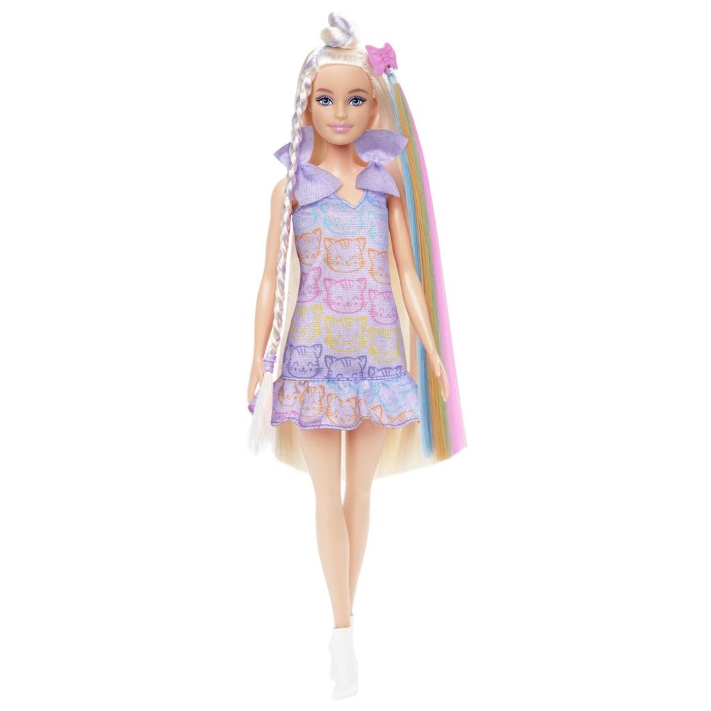 Panenka Barbie miluje parádění a potěší všechny malé milovnice vlasových proměn! Panenka s extra dlouhými vlasy s barevnými pramínky čeká na nový účes – klidně každý den jiný. Součástí balení je 10 doplňků na česání a styling, včetně duhového příčesku, mašlí, čelenky s kočičími oušky a náhradního oblečku. Malé stylistky si zamilují kombinování outfitů i tvoření copánků, drdolů nebo pestrobarevných účesů. Skvělý dárek pro děti od 3 let. Panenka nemůže stát samostatně. Barvy a vzhled výrobku se mohou lišit.