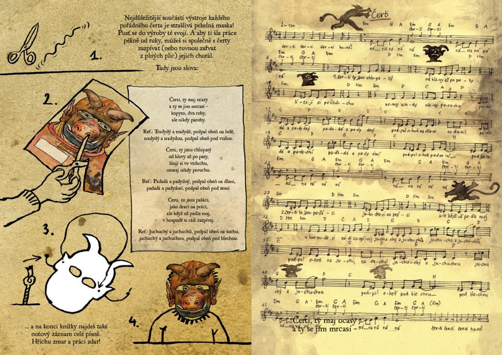 V téhle originální knížce najdete součást speciální jímkařské výstroje: strašidelné čertovské masky k vystřižení. Barevné, které si stačí jen nasadit a všem hříšníkům okamžitě zavařit, a černobílé k samostatnému vybarvení. A k práci nebo při strašení si můžete zazpívat (zařvat) společně s čerty jejich pekelnou píseň. Hezkou zábavu a hříchu zmar!