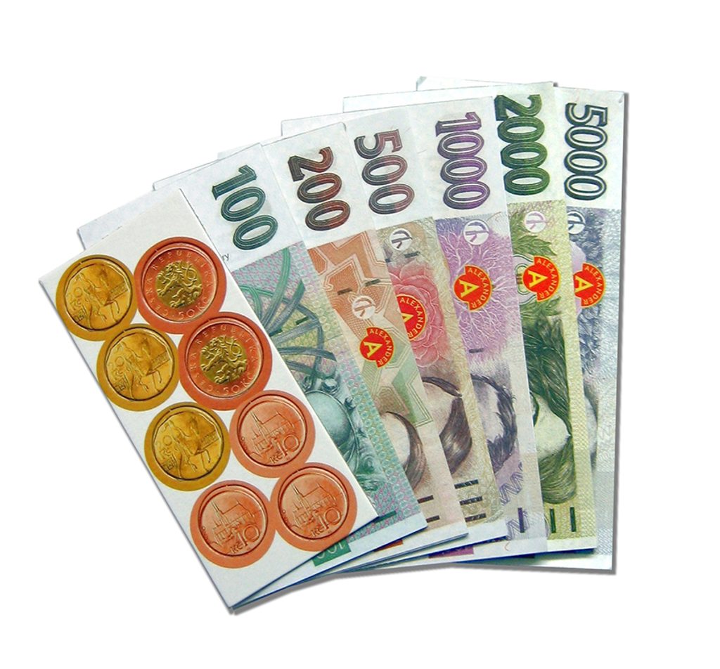 České koruny s mincemi - peníze do hry bankovky s mincemi. V balení naleznete 6 druhů velkých a sytě barevných českých bankovek a k tomu ještě mince 10, 20 a 50 Kč. Vhodné k různým dětským hrám a jako naučná pomůcka. Poslouží nejen jako doplněk k různým hrám na nákupy, ale také k seznámení malých dětí s hodnotou peněz nebo pro školní výuku. Balení obsahuje: 102 ks bankovek (6 druhů: 100, 200, 500, 1000, 2000, 5000) v hodnotě 149 150,-Kč a mince 10, 20 a 50 Kč.