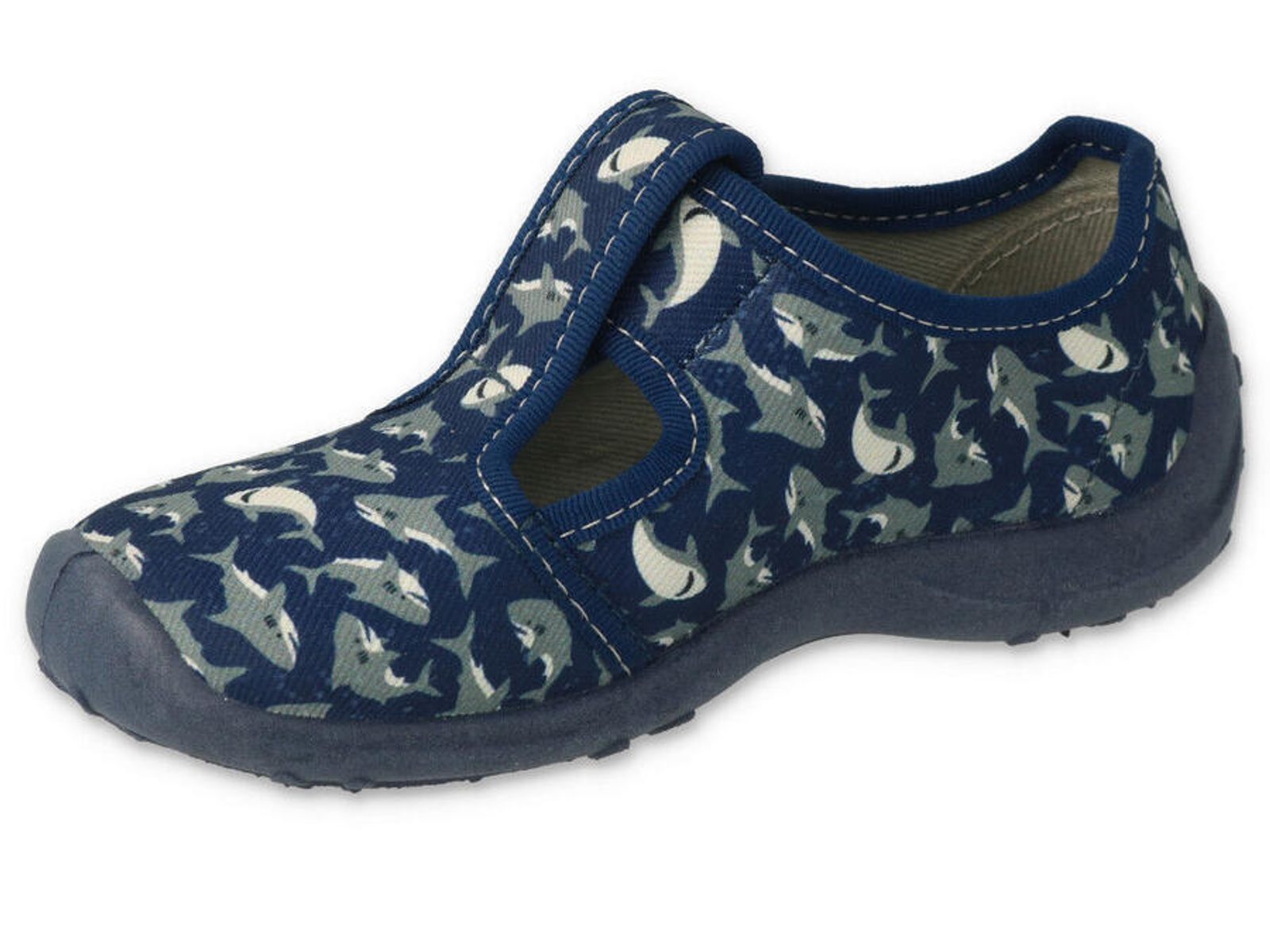 Domácí obuv na suchý zip od značky Befado s motivem žraloků.