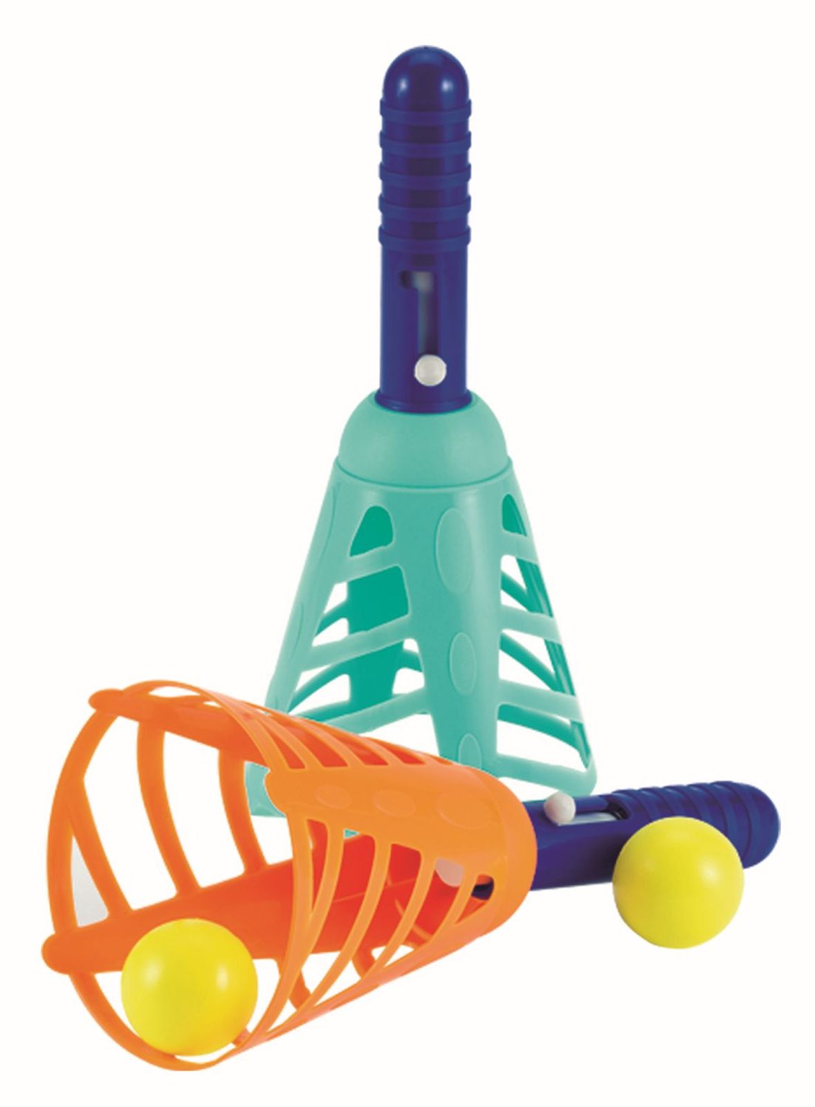 Tato hra je ideální pro trénink koordinace mezi rukou a očima. Cílem hry je vystřelovat míček a chytat ho do košíku. Pro 1-2 hráče. Sada obsahuje 2 koše do ruky a 2 míčky.