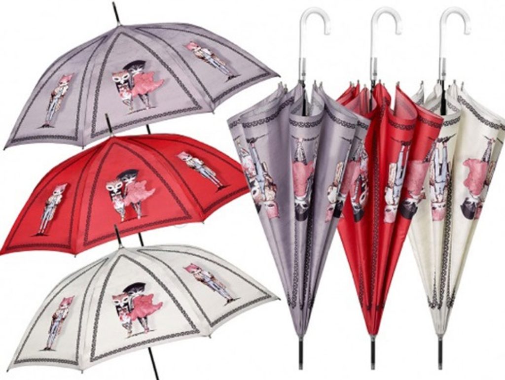 Dáždnik s potlačou Mačiek, polomer látky 61 cm, dĺžka dáždnika vrátane rukoväte 86 cm, automatické otváranie dešníku, 8 dielna konštrukcia, dáždnik má celoskloláminatovou konštrukciu, ktorá je pružnejšia a odolnejšia, povrchový materiál 100% polyester, priehľadná rukoväť
