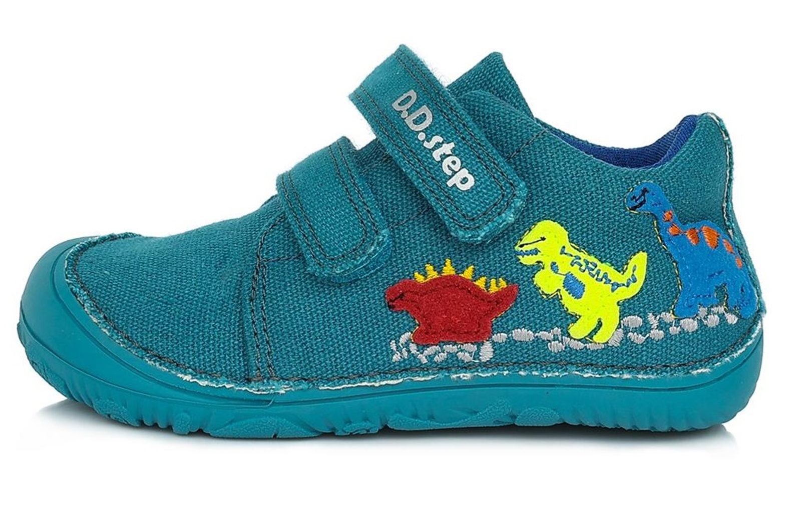 DDstep dětské plátěné BAREFOOT boty modré s dinosaury