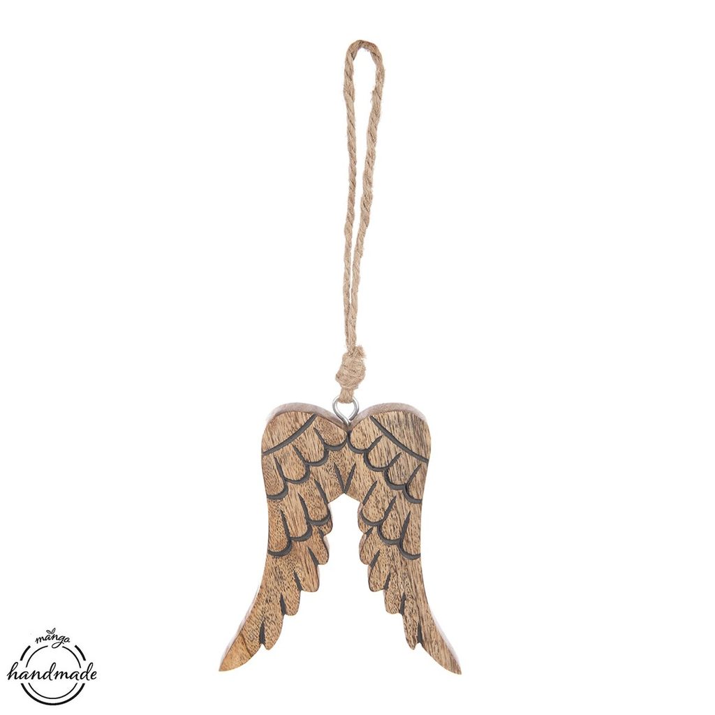 Dekorace ANDĚLSKÁ KŘÍDLA na zavěšení ozdobí vaši domácnost nejen v období Vánoc, využít ji můžete po celý rok. Vhodná také jako dárek. Materiál: mangové dřevo, kov, juta. Rozměry: š. 11,8 cm, v. 13,8 cm, v. s provazem 29,5 cm.