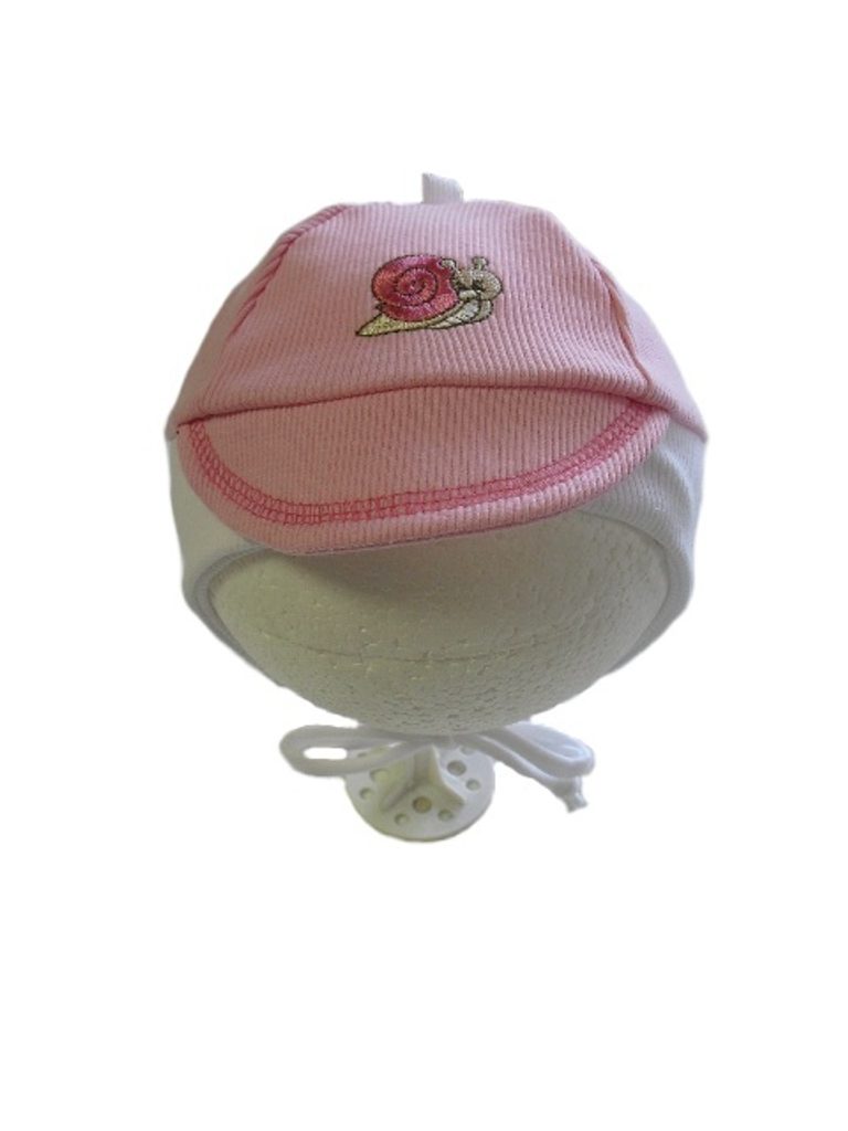 Růžová úpletová čepice Hugo s měkkým kšiltem a nášivkou šnečka.Zavazování pod krkem.