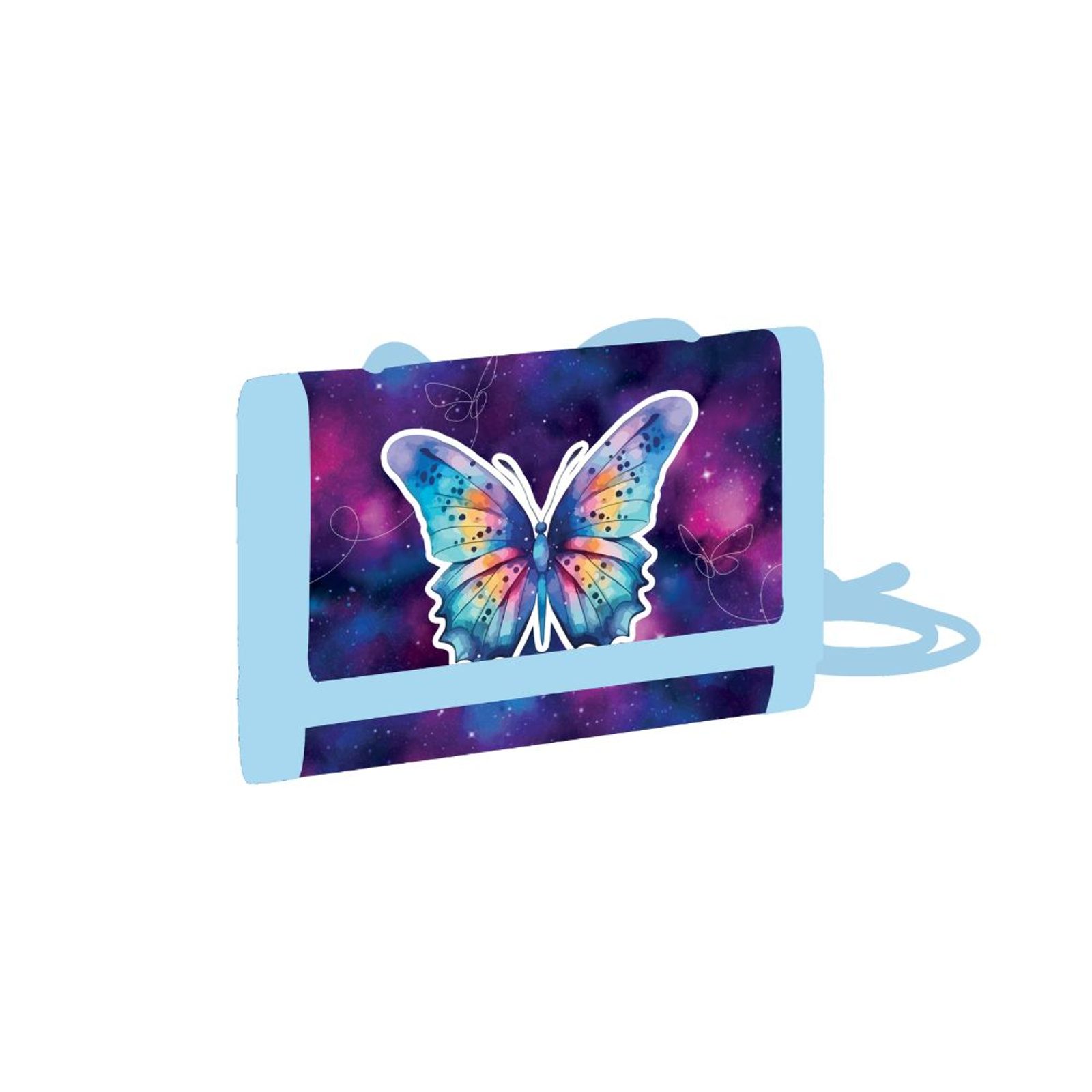 Dětská textilní peněženka na suchý zip s praktickou šňůrkou na krk. Vzadu najdete uzavíratelnou kapsičku na mince, uvnitř jednu přihrádku na bankovky, šest kapsiček na karty a jednu průhlednou kapsu.