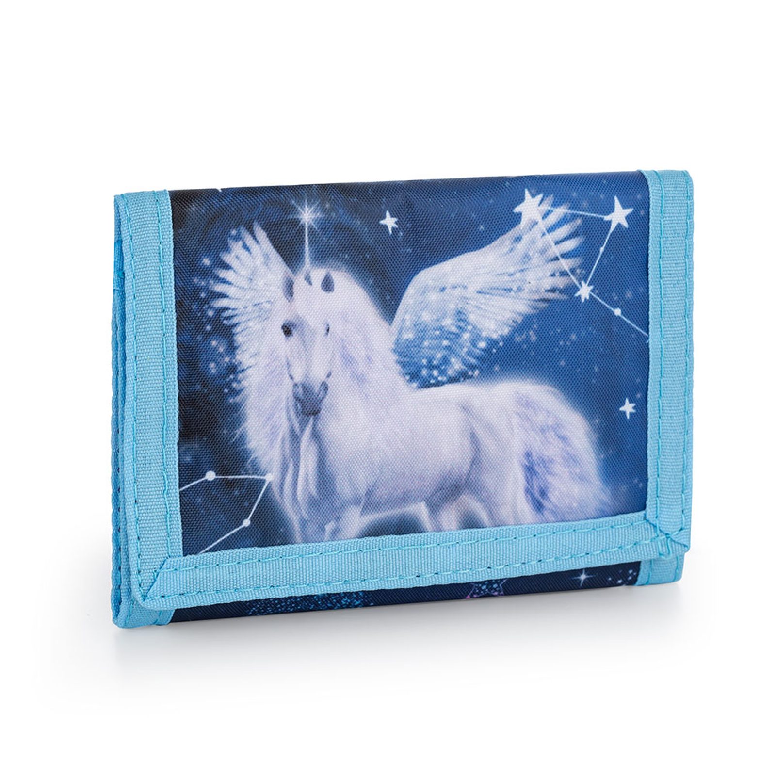 Praktická textilní peněženka na suchý zip. Vzadu je uzavíratelná kapsička na drobné, uvnitř jedna přihrádka na bankovky, šest kapsiček na karty a jedna průhledná kapsa.