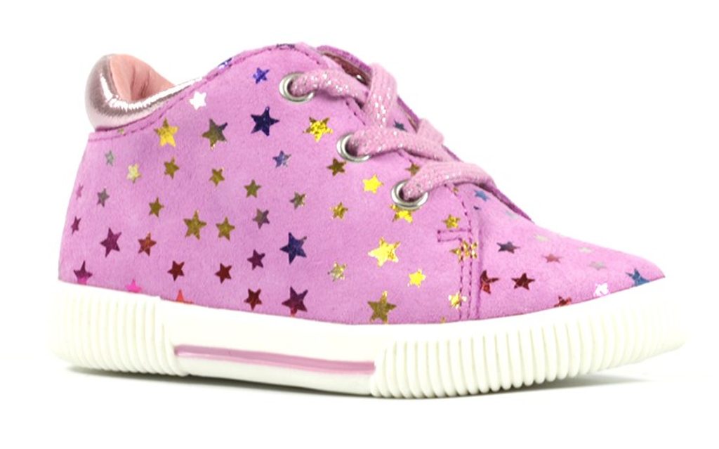 - Dětské kotníkové boty ze semiše a efektního materiálu s potiskem hvězdiček a šněrováním.