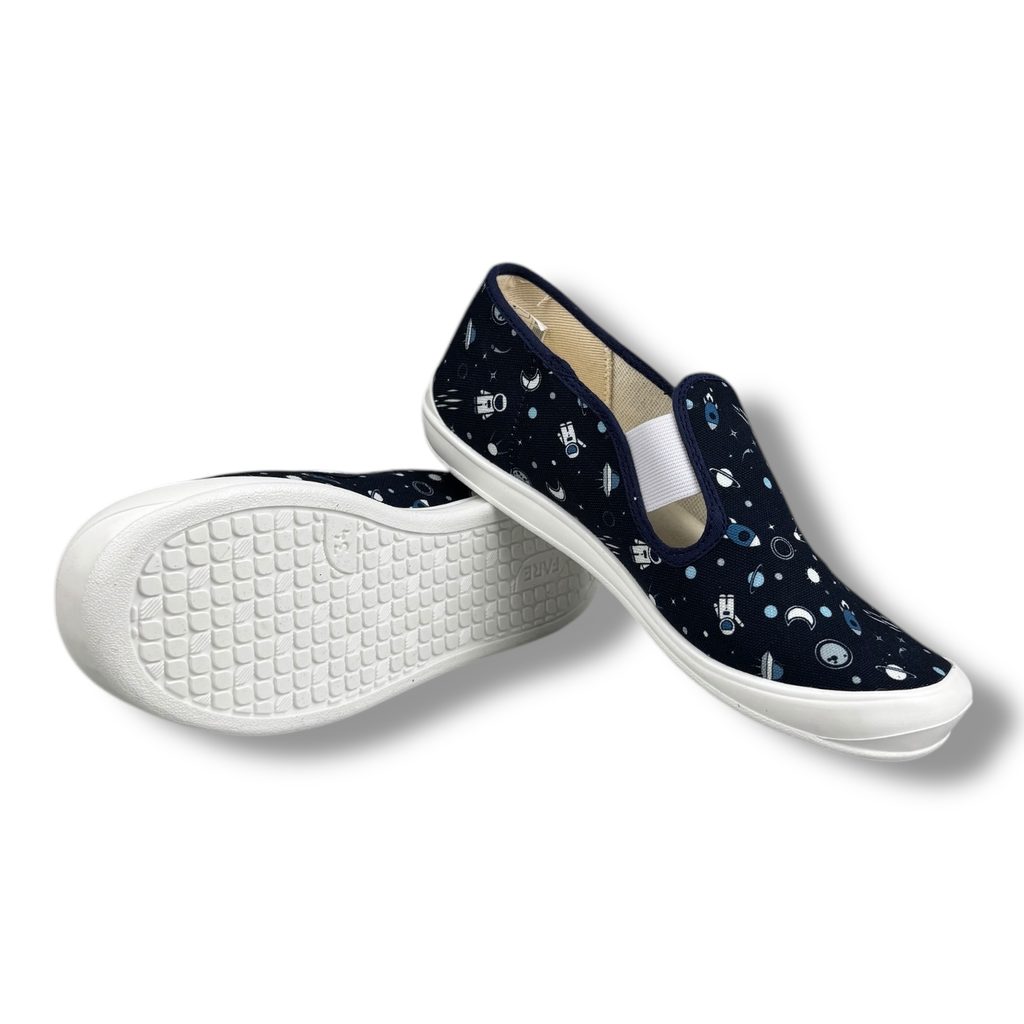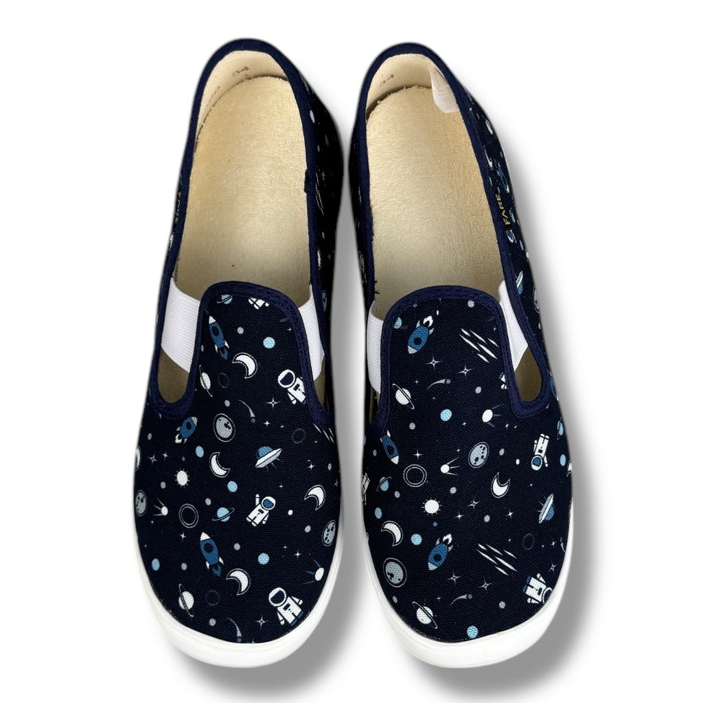 Přezůvková, nízká, textilní, lemovaná obuv, pruženkové uzavírání.