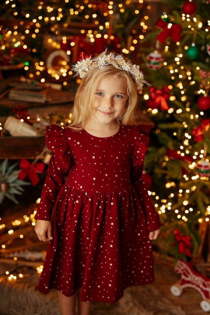 Krásné vínové šaty se zlatými hvězdičkami, vhodné na Vánoční focení či ke stromečku.