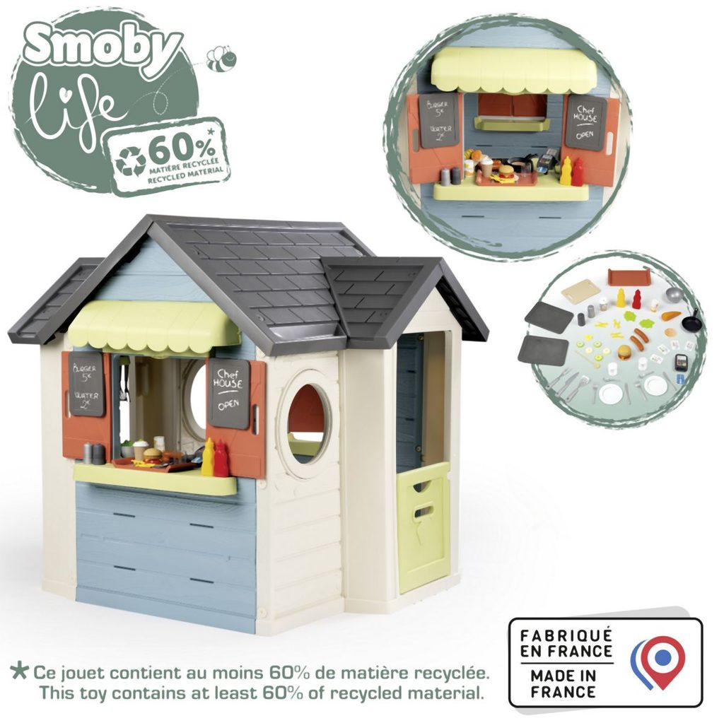 Domeček Chef kombinuje zahradní domeček, restauraci a obchod. S pultem, markýzou, malou kuchyňkou, pokladnou, herním jídlem a další. Domeček má malé vstupní dveře a dvě okna s otočnými žaluziemi. Disponuje dvěmi tabulemi, na které lze napsat menu nebo otevírací dobu. Součástí příslušenství je lednice, trouba, plynový gril s pohyblivými plameny, dřez s kohoutkem, dvě police, pokladna s kalkulačkou a čtečkou kreditních karet, vč. karty. K dispozici jsou také sladká a slaná jídla, kečup, omáčky, pánvička se snadným otáčením s palačinkou, slánka a pepřenka s „cvaknutím“, příbory a nádobí. Stabilní robustní odolný plast s ochranou proti UV záření. Obsahuje celkem 48 kusů příslušenství. Domeček je kompatibilní s veškerým příslušenstvím, kromě komína. Výška dveří od země 46,3 cm. Tento výrobek obsahuje minimálně 60 % recyklovaného materiálu. Rozměry sestaveného domečku: 124 x 132 x 135 cm (DxŠxV). Domeček Chef kombinuje zahradní domeček, restauraci a obchod. S pultem, markýzou, malou kuchyňkou, pokladnou, herním jídlem a další. Domeček má malé vstupní dveře a dvě okna s otočnými žaluziemi. Disponuje dvěmi tabulemi, na které lze napsat menu nebo otevírací dobu. Součástí příslušenství je lednice, trouba, plynový gril s pohyblivými plameny, dřez s kohoutkem, dvě police, pokladna s kalkulačkou a čtečkou kreditních karet, vč. karty. K dispozici jsou také sladká a slaná jídla, kečup, omáčky, pánvička se snadným otáčením s palačinkou, slánka a pepřenka s „cvaknutím“, příbory a nádobí. Stabilní robustní odolný plast s ochranou proti UV záření. Obsahuje celkem 48 kusů příslušenství. Domeček je kompatibilní s veškerým příslušenstvím, kromě komína. Výška dveří od země 46,3 cm. Tento výrobek obsahuje minimálně 60 % recyklovaného materiálu. Rozměry sestaveného domečku: 124 x 132 x 135 cm (DxŠxV).