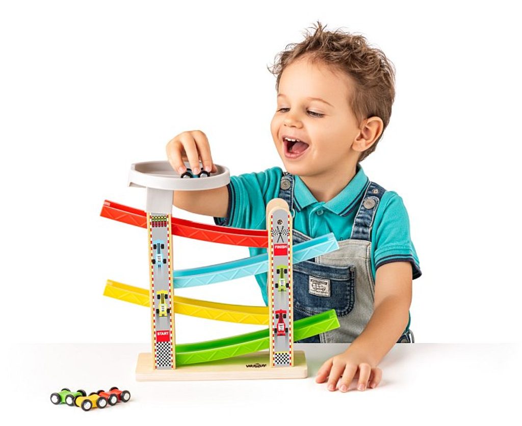 Hračka pro nejmenší. Dítě umístí autíčka na horní plochu dráhy, naklopí ji a autíčka sjedou po dráze dolů. Rozvoj jemné motoriky a koordinace oko-ruka.