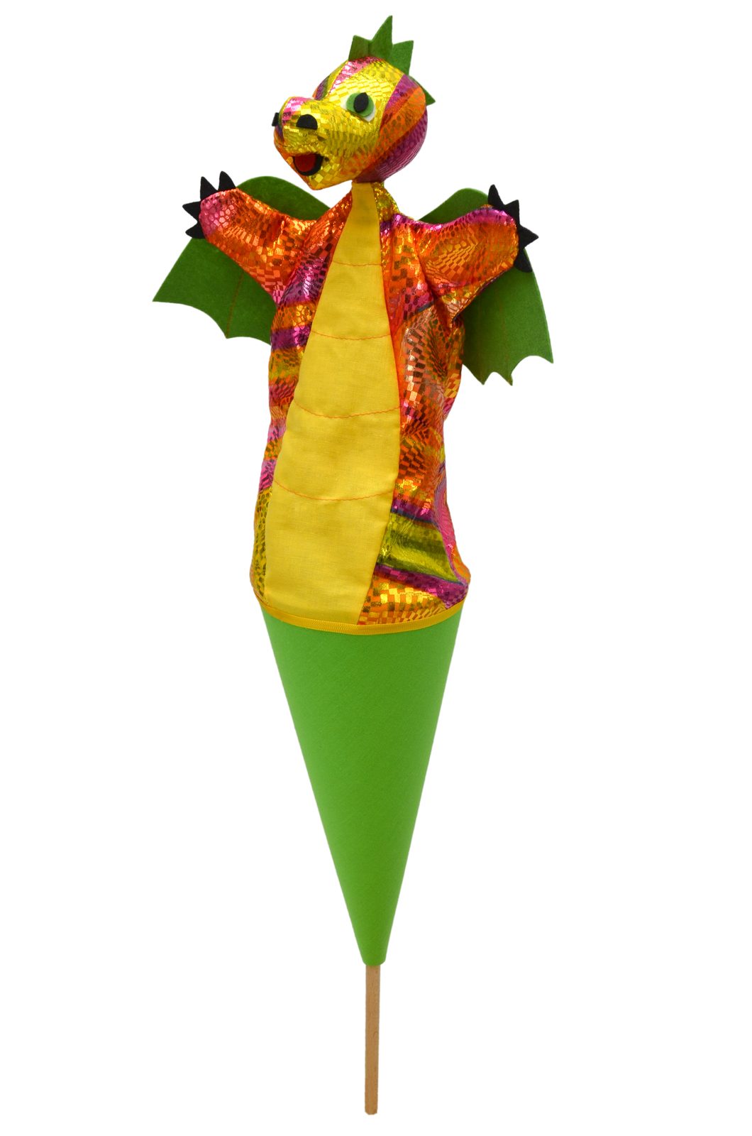 Velký textilní kornoutový maňásek, ovládaný dřevěnou tyčkou, s otvorem pro ovládání ručiček. Vyrobeno v ČR.