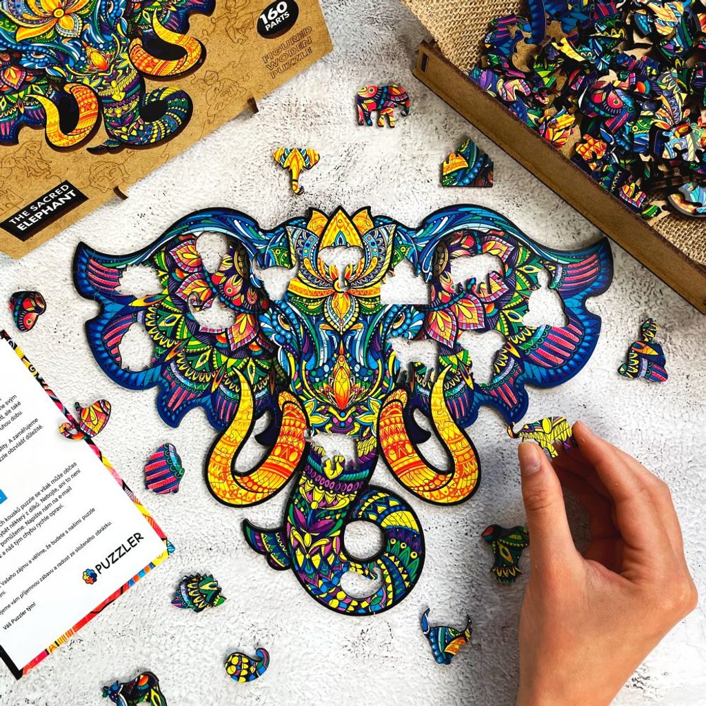 Při skládání puzzle s obrázkem slona se můžete v myšlenkách přenést do Jihovýchodní Asie. Celé toto puzzle obsahuje 160 dílků. A jejich tvar je unikátní v tom, že souvisí právě s tematikou posvátné Indie.