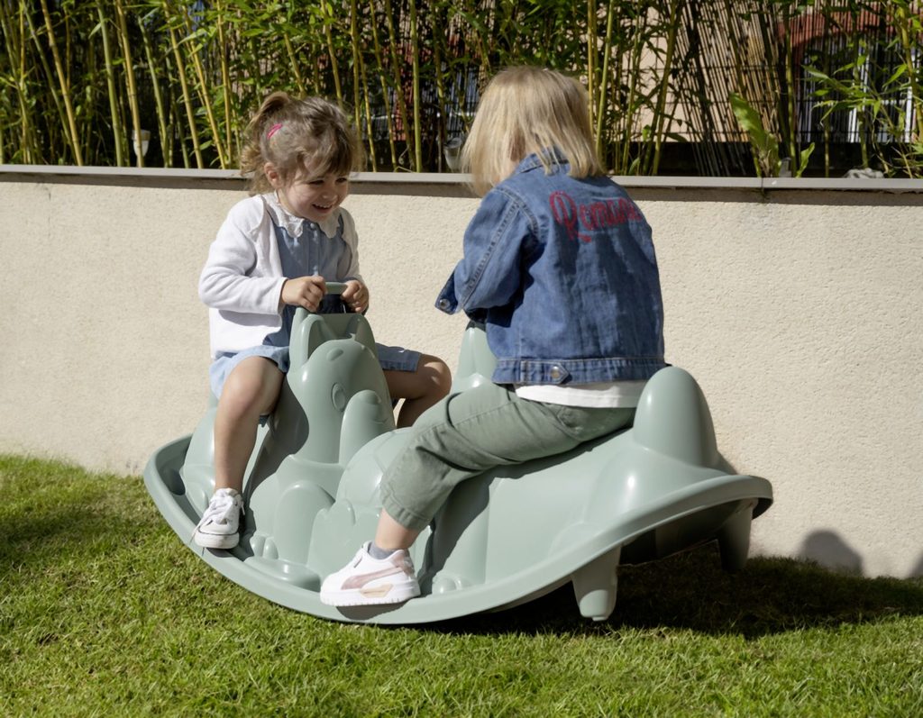 Dvojitá houpačka s ergonomickými sedátky ve tvaru pejska v zelenošedé barvě. Dvě držátka pro bezpečné použití. Plastové díly jsou ošetřeny anti-UV, což zajišťuje dobrou odolnost a stálost barev v průběhu času. Tento výrobek obsahuje minimálně 96% recyklovaného materiálu.