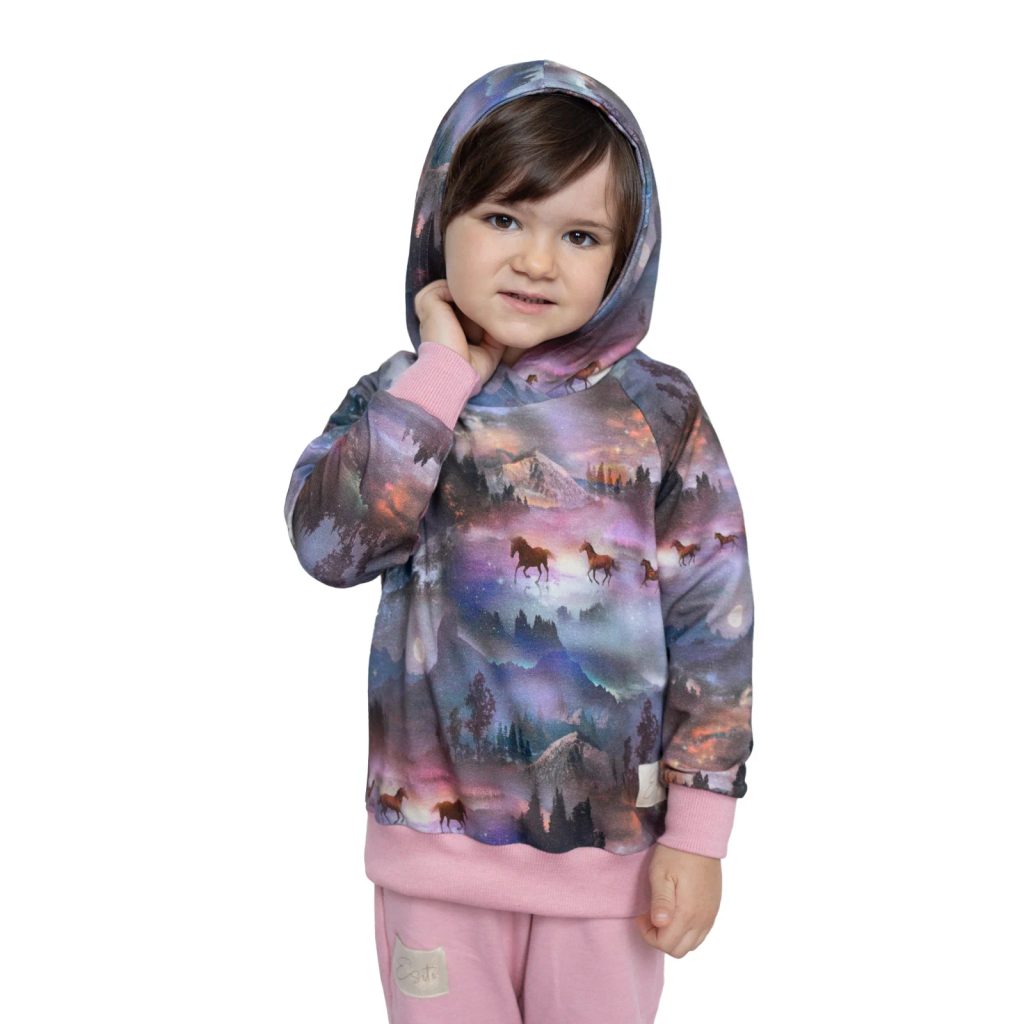 Popis:     Dětská mikina s kapucí Horses. Designový kousek, který nesmí chybět v šatníku žádné slečny. Vyšší gramáž, teplákovina v certifikované kvalitě s digitálním potiskem. Díky 5% elastanu zůstává mikina tvarově perfektní i po mnoha vypráních. Přitom 95% bavlny zaručuje příjemné nošení v ještě lepším komfortu. Dvouvelikostní mikina vydrží na delší čas.   Materiál:   - mikina: teplákovina 95% bavlna 5% elastan 225 gr/m2   - náplet u rukávů a spodní části mikiny: 96% bavlna + 4% elastan   Velikosti: Dvouvelikosti od 74 - do 134     Údržba:   - Praní: ANO, max. 40°C ideálně po rubu.   - Ostatní dle etikety na vnitřním bočním lemu.   Záruka kvality:   - Certifikát Oeko-tex Standard 100® pro děti do 3 let   - Dětská mikina je navržena, vyrobena a zabalena na území Česka.   - Značková dětská mikina od ESITO®.   Kvalitní české dětské oblečení. Vyrobeno s péčí a láskou k dětem v podhůří Orlických hor.