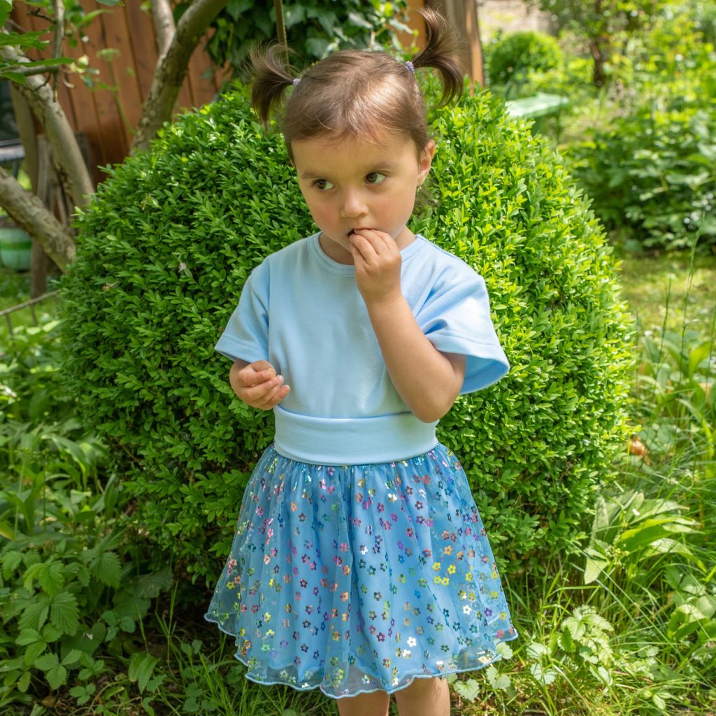 Popis:      Dívčí kolová sukně flower tulle nad kolena. Kolová sukně se hodí k mnoha příležitostem neformální setkání, nebo i do školky, ale hlavně na oslavy a slavnostní setkání. Je tedy vhodná na běžné i parádní nošení.    Jedná se o letní velmi vzdušnou a pohodlnou sukni s pružným lemem v pase. Pohodlné řešení bez jakýchkoliv otlaků nebo sjíždění kamkoliv. Úžasně pohodlná kolová sukně je ušita jako dvouvelikostní, takže ušetříte.    Velikosti (dvouvelikosti):    - 74 - 80   - 86 - 92   - 98 - 104   - 110 - 116          Materiál:   - Sukně: spodní díl jednolicní úplet 95% bavlna + 5 % elastan   - Sukně: vrchní díl potištěný tyl s kytičkama   - Lem v pase: 96 bavlna + 4% elastan.   Praní a žehlení:    - Na etiketě výrobku.   Záruka kvality:  - Veškeré naše oblečení je navrženo, vyrobeno a zabaleno na území Česka.  - Jedná se tedy o 100% český výrobek té nejvyšší kvality. Doporučujeme!   - Certifikace "Oeko-tex Standard 100" pro děti do 3 let  - Značkový výrobek ESITO®.   Kvalitní české dětské oblečení. Vyrobeno s péčí a láskou k dětem v podhůří Orlických hor.