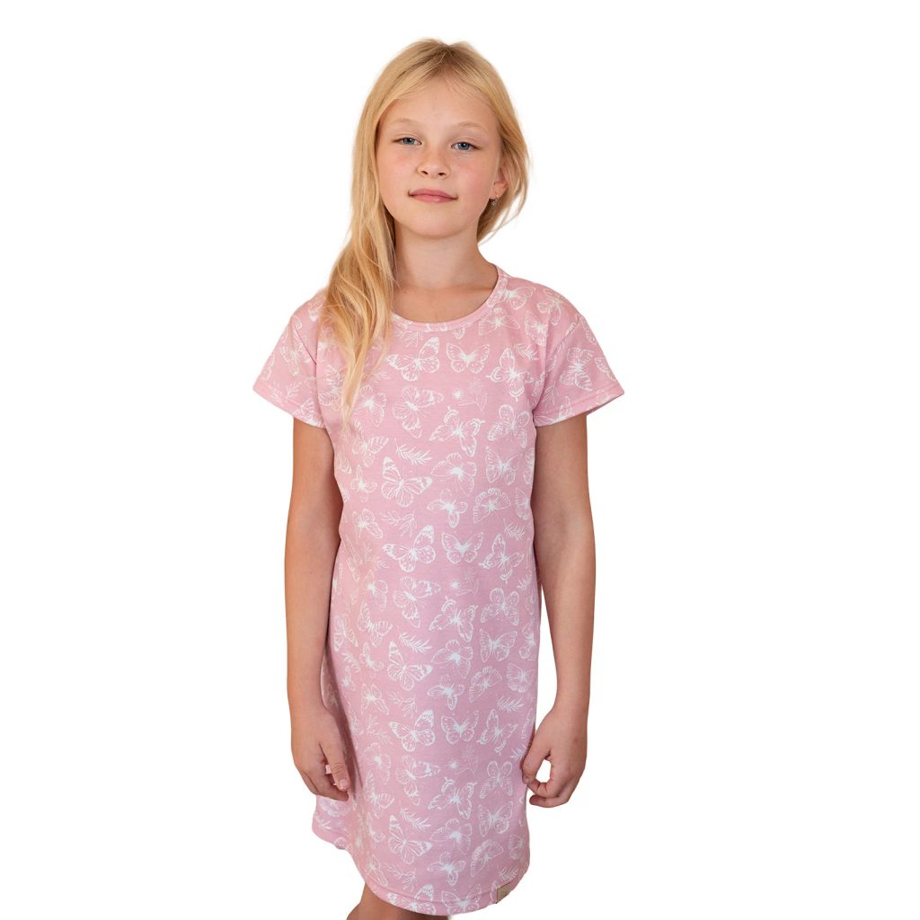 Naše Dívčí noční košile Motýlek je víc než jen krásná noční košilka – je to symbol lásky, komfortu a elegance, který přinese radost do každého večera.   Proč si ji zamilujete?   1. 100% Certifikovaná bavlna – Vyrobená ze 100% certifikované bavlny, která je jemná k dětské pokožce, hypoalergenní a prodyšná. Vaše malá princezna si zaslouží to nejlepší!   2. Nadčasový design – Krátké rukávy a kulatý výstřih dodávají košilce klasický a elegantní vzhled, který nikdy nevyjde z módy. Délka nad kolena je ideální pro pohodlí a volnost pohybu.   3. Kouzelný vzor – Motýlek není jen tak obyčejný design. Je to vzor, který září krásou a roztomilostí, takže vaše malá slečna si ho zamiluje na první pohled. Ať už doma nebo venku, vždy bude vypadat úchvatně!   4. Celoroční pohodlí – Naše košilka je ideální pro celoroční nošení. V chladnějších měsících se jednoduše zachumláte pod teplejší peřinku a v létě si užijte její lehkost a prodyšnost.     Jak pečovat o košilku? Košilku doporučujeme prát max. na 40°C s podobnými barvami. Nepoužívejte bělidla a sušte ji na vzduchu nebo v sušičce s programem sušení na chladné teploty, abyste zachovali její jemnost a barvy.   V jakých velikostech je košilka dostupná?   Košilku nabízíme v široké škále velikostí a to od vel. 98 do vel. 146/152, takže si můžete být jisti, že najdete tu správnou velikost pro vaši malou princeznu.   Proč čekat?   Dejte své malé slečně dárek, který ji bude provázet každou noc. Dívčí noční košile Hvězdné srdce je víc než jen oblečení – je to kousek radosti a pohádkového světa, který si zamiluje. Nenechte si ujít tuto jedinečnou příležitost a objednejte ještě dnes!   Představte si, jak vaše malá hvězdička usíná s úsměvem na tváři, obklopená jemností a láskou.              Vyrobeno s péčí a láskou k dětem v podhůří Orlických hor.