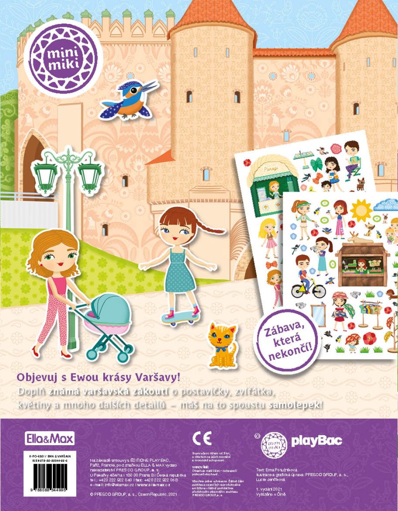 Oblíbená série minimiky přichází s další novinkou v podobě zábavné samolepkové knížky, v níž budou děti společně s panenkou Ewou a jejími kamarádkami Agnieszkou a Olgou objevovat nejznámější kouty polské metropole Varšavy. Tamní scenerie mohou doplňovat spoustou krásných, opakovaně použitelných samolepek podle vlastní fantazie a v knížce najdou také mnoho zajímavých informací o varšavských památkách, významných místech, ale také třeba o polské kultuře.