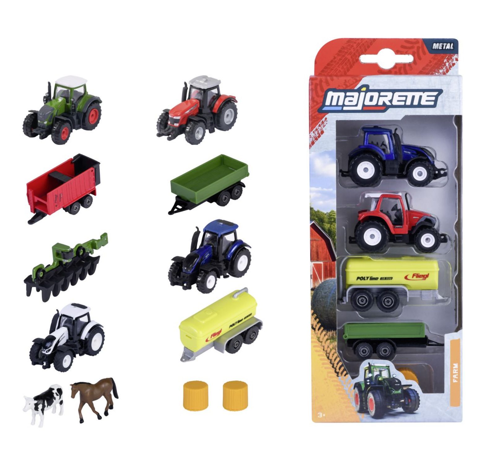 Sada 5 kovových vozidel a příslušenství z farmy na volnoběh. Pohyblivé a/nebo otevírací díly. Délka 7 cm. 2 druhy.