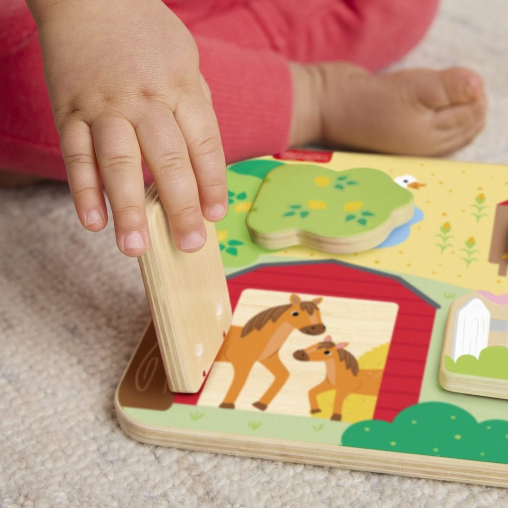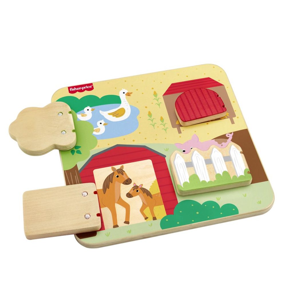 Dřevěná deska se zvířátky z farmy od Fisher-Price® je plná zábavných překvapení! Tato hrací deska, která je vyrobena ze dřeva z dobře obhospodařovaných zdrojů s certifikátem Forest Stewardship Council (FSC C004225), obsahuje 4 dvířka, která se otevírají a odhalují různá přátelská zvířátka z farmy a jejich mláďátka.
